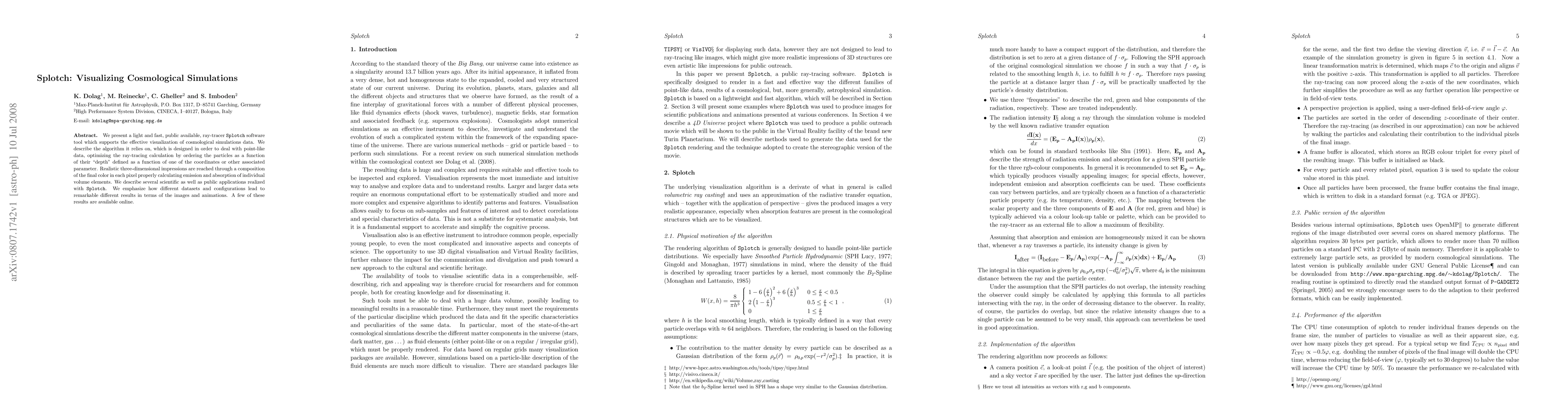 The paper introduces {\tt Splotch}, a lightweight ray-tracer for fast visualization of cosmological simulation data, optimizing ray-tracing through depth-ordering of particles. The tool produces realistic 3D impressions by calculating emission and absorption, and showcases diverse applications and results.