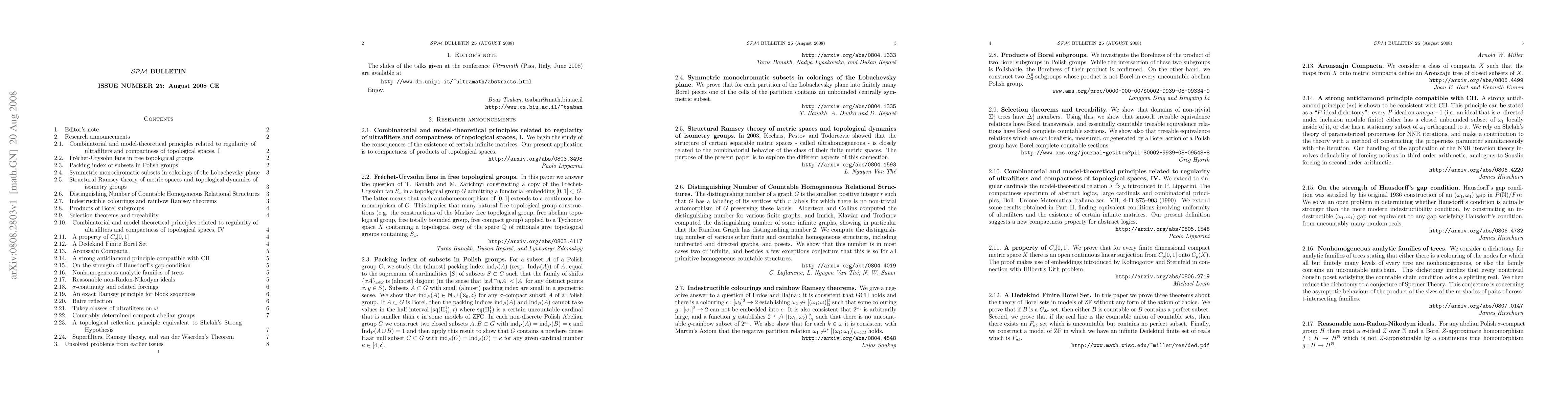 Contents: 1. Combinatorial and model-theoretical principles related to regularity of ultrafilters and compactness of topological spaces, I; 2. Frechet-Urysohn fans in free topological groups; 3. Packing index of subsets in Polish groups; 4. Symmetric monochromatic subsets in colorings of the Lobachevsky plane; 5. Structural Ramsey theory of metric spaces and topological dynamics of isometry groups; 6. Distinguishing Number of Countable Homogeneous Relational Structures; 7. Indestructible colourings and rainbow Ramsey theorems; 8. Products of Borel subgroups; 9. Selection theorems and treeability; 10. Combinatorial and model-theoretical principles related to regularity of ultrafilters and compactness of topological spaces, IV; 11. A property of Cp[0, 1]; 12. A Dedekind Finite Borel Set; 13. Aronszajn Compacta; 14. A strong antidiamond principle compatible with CH; 15. On the strength of Hausdorff's gap condition; 16. Nonhomogeneous analytic families of trees; 17. Reasonable non-Radon-Nikodym ideals; 18. Continuity and related forcing; 19. An exact Ramsey principle for block sequences; 20. Baire reflection; 21. Tukey classes of ultrafilters on; 22. Countably determined compact abelian groups; 23. A topological reflection principle equivalent to Shelah's Strong Hypothesis; 24. Superfilters, Ramsey theory, and van der Waerden's Theorem.