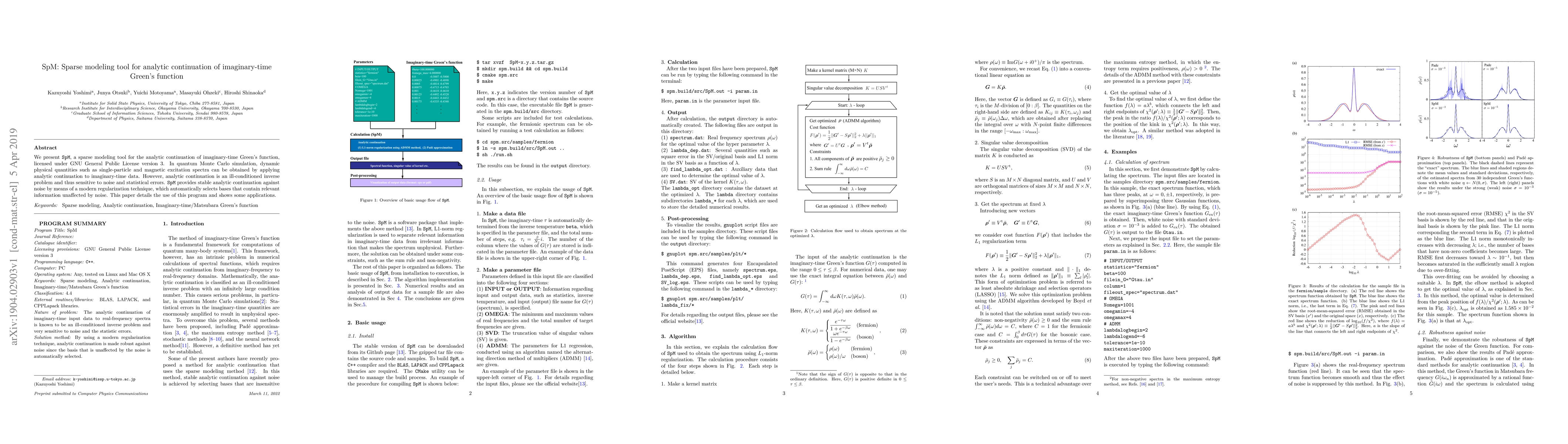 SpM is a tool for stable analytic continuation of imaginary-time Green's functions in quantum Monte Carlo simulations, addressing the challenges of noise and statistical errors through regularization. It automatically selects relevant bases to ensure accurate dynamic physical quantity extraction.