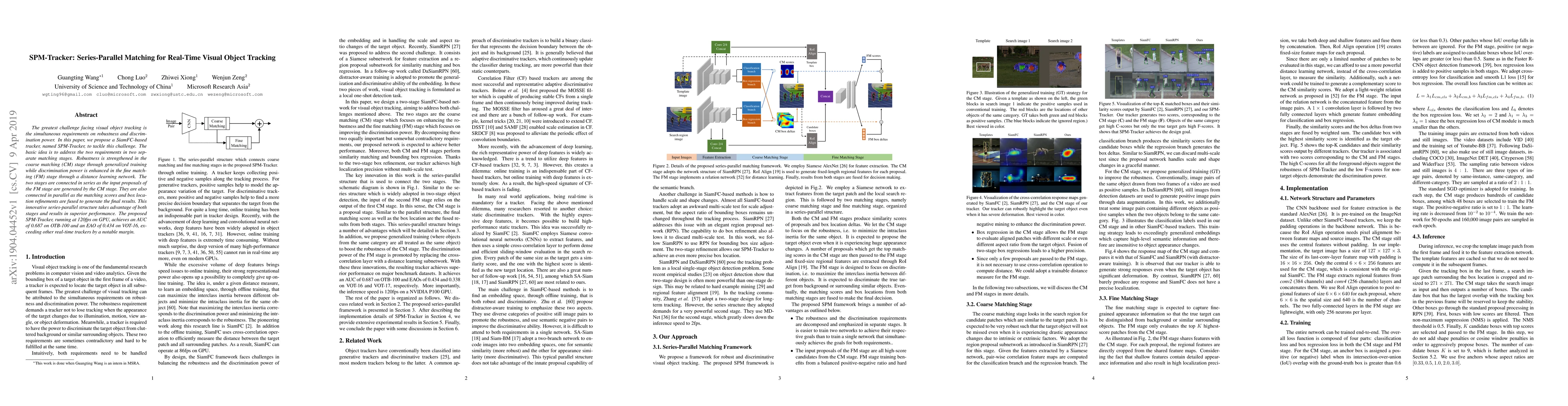 SPM-Tracker introduces a SiamFC-based approach for real-time visual object tracking, combining robust coarse matching with discriminative fine matching in a series-parallel structure to achieve superior performance, outperforming other real-time trackers.