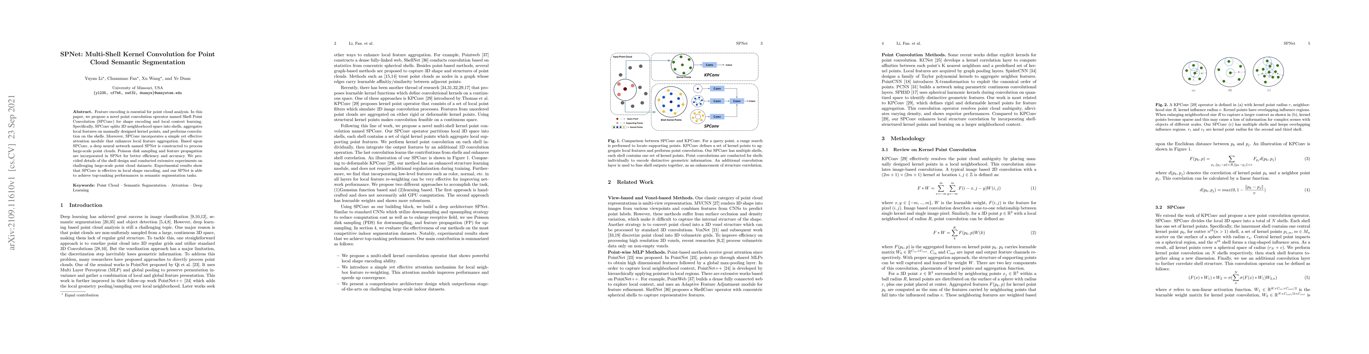 This paper proposes Shell Point Convolution (SPConv) for point cloud semantic segmentation, which splits 3D neighborhood space into shells and aggregates local features for enhanced shape encoding. SPNet, built upon SPConv, incorporates Poisson disk sampling and feature propagation, achieving top-ranking performance on large-scale point cloud datasets.