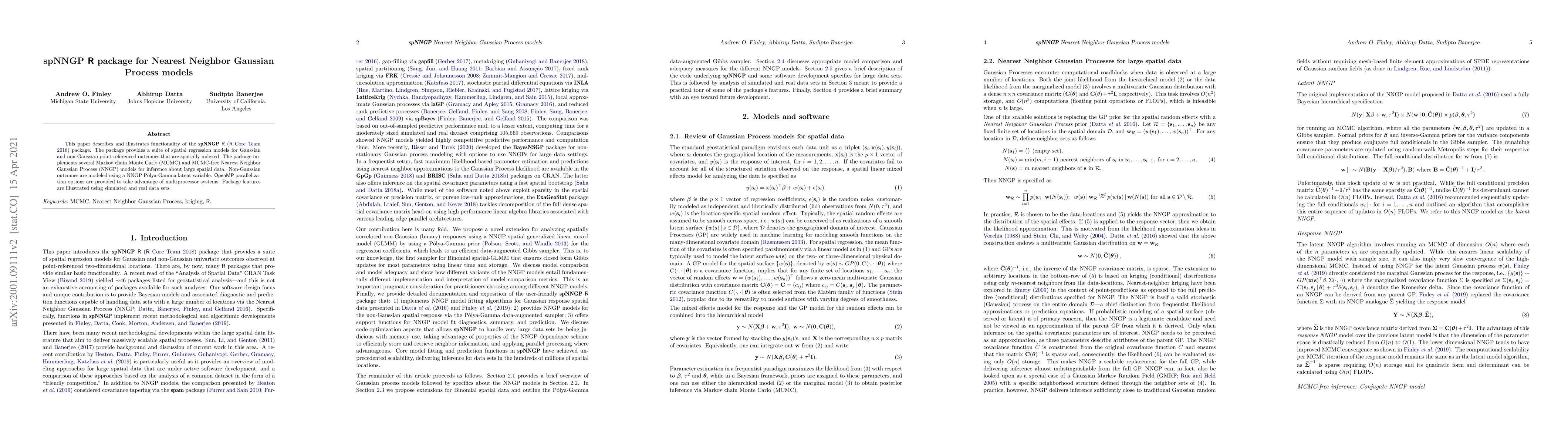 The spNNGP R package offers spatial regression models for Gaussian and non-Gaussian outcomes, utilizing Nearest Neighbor Gaussian Process (NNGP) models with MCMC and MCMC-free methods. It includes parallelization for multiprocessor systems and demonstrates functionality with both simulated and real data.
