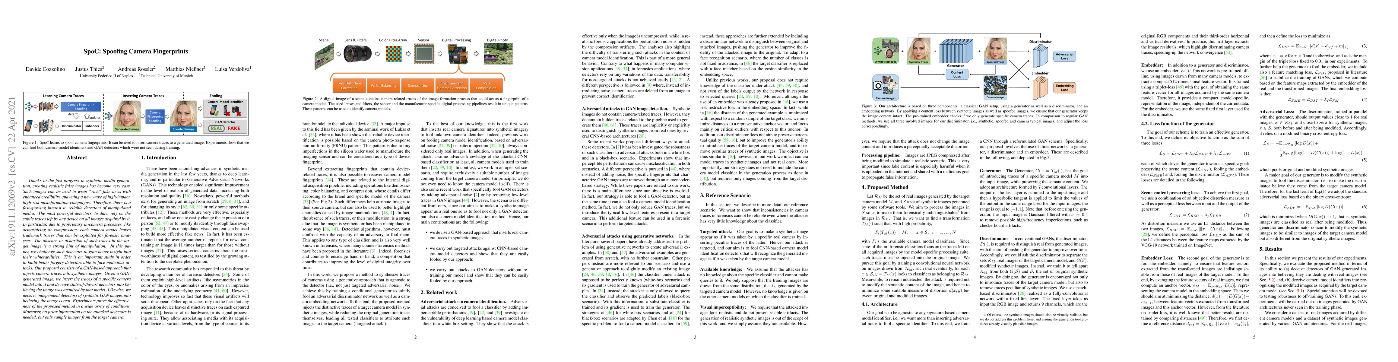 The paper proposes a GAN-based approach, SpoC, that injects camera traces into synthetic images to deceive both forgery detectors and independent synthetic image detectors. It uses an embedder pre-trained offline to extract a compact 512-dimensional feature vector, independent of the current data, and a generator trained with a sum of three losses: preserving scene content, fooling the embedder, and fooling the discriminator.