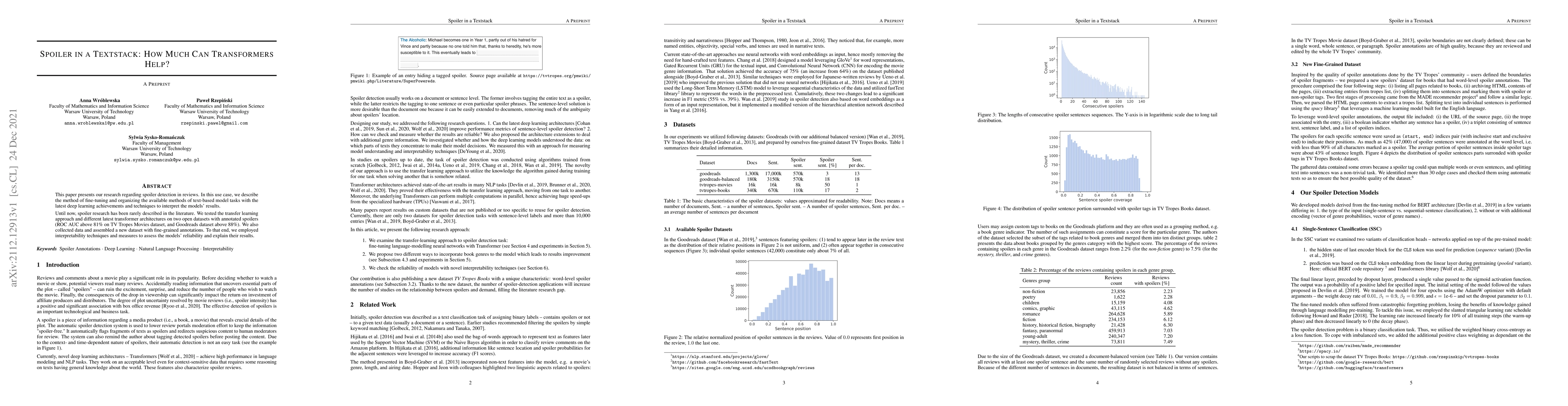 This paper presents our research regarding spoiler detection in reviews. In this use case, we describe the method of fine-tuning and organizing the available text-based model tasks with the latest deep learning achievements and techniques to interpret the models' results. Until now, spoiler research has been rarely described in the literature. We tested the transfer learning approach and different latest transformer architectures on two open datasets with annotated spoilers (ROC AUC above 81\% on TV Tropes Movies dataset, and Goodreads dataset above 88\%). We also collected data and assembled a new dataset with fine-grained annotations. To that end, we employed interpretability techniques and measures to assess the models' reliability and explain their results.