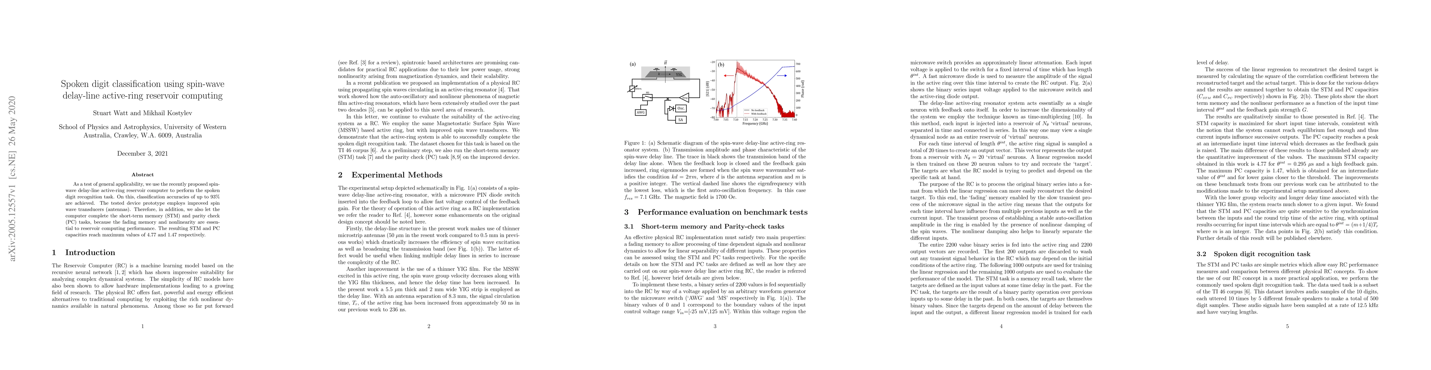 As a test of general applicability, we use the recently proposed spin-wave delay line active-ring reservoir computer to perform the spoken digit recognition task. On this, classification accuracies of up to 93% are achieved. The tested device prototype employs improved spin wave transducers (antennas). Therefore, in addition, we also let the computer complete the short-term memory (STM) task and the parity check (PC) tasks, because the fading memory and nonlinearity are essential to reservoir computing performance. The resulting STM and PC capacities reach maximum values of 4.77 and 1.47 respectively.