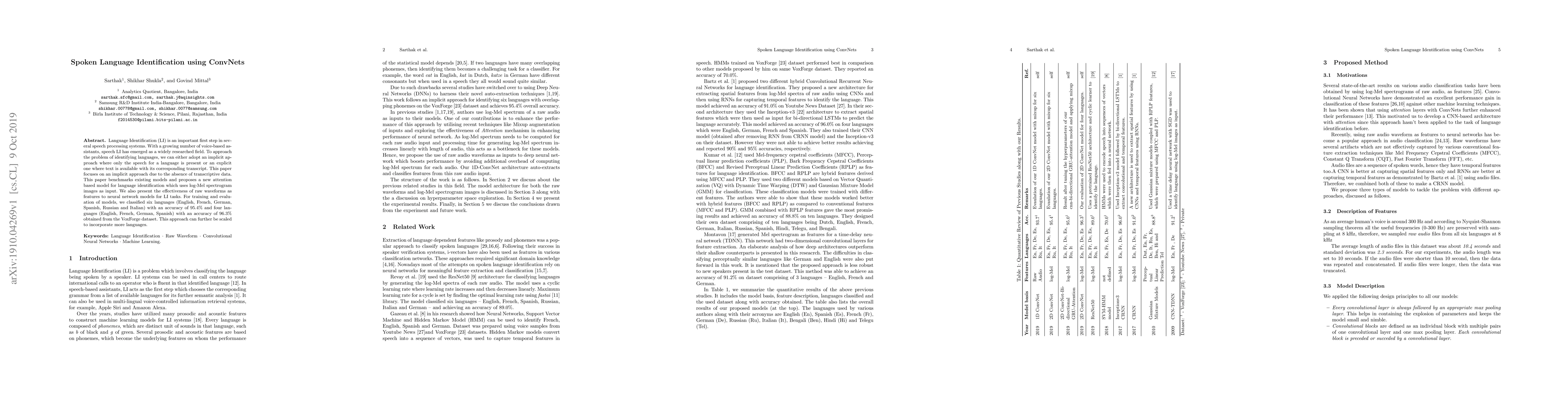 Language Identification (LI) is an important first step in several speech processing systems. With a growing number of voice-based assistants, speech LI has emerged as a widely researched field. To approach the problem of identifying languages, we can either adopt an implicit approach where only the speech for a language is present or an explicit one where text is available with its corresponding transcript. This paper focuses on an implicit approach due to the absence of transcriptive data. This paper benchmarks existing models and proposes a new attention based model for language identification which uses log-Mel spectrogram images as input. We also present the effectiveness of raw waveforms as features to neural network models for LI tasks. For training and evaluation of models, we classified six languages (English, French, German, Spanish, Russian and Italian) with an accuracy of 95.4% and four languages (English, French, German, Spanish) with an accuracy of 96.3% obtained from the VoxForge dataset. This approach can further be scaled to incorporate more languages.