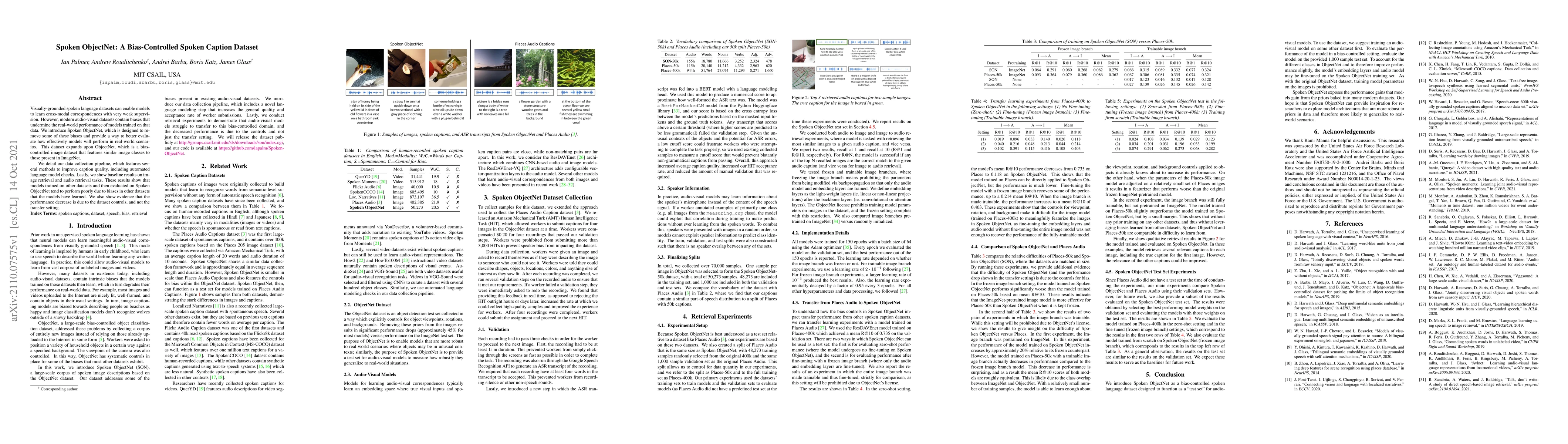 A new spoken caption dataset called Spoken ObjectNet aims to reduce biases in audio-visual datasets, allowing models to better perform in real-world scenarios. It shows that models trained on other biased datasets tend to perform poorly when evaluated on Spoken ObjectNet.
