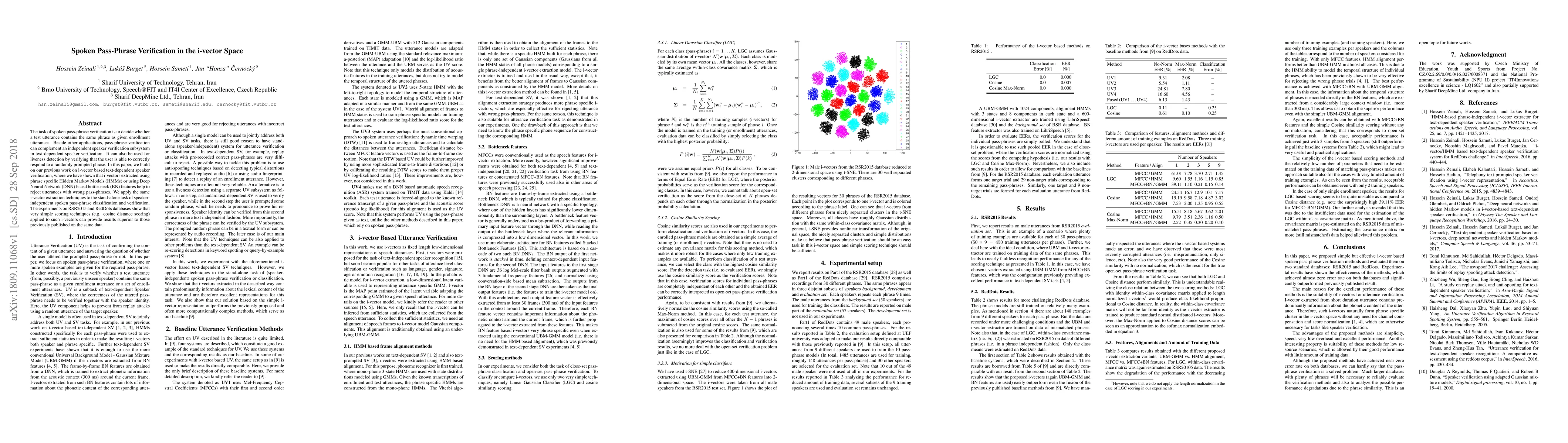 The paper proposes i-vector based spoken pass-phrase verification methods and evaluates them on RSR2015 and RedDots databases. i-vectors are extracted using UBM-GMM and MFCC+BN features with HMM or UBM-GMM alignment. Simple scoring techniques like Linear Gaussian Classifier (LGC) and cosine similarity are used for classification and verification.