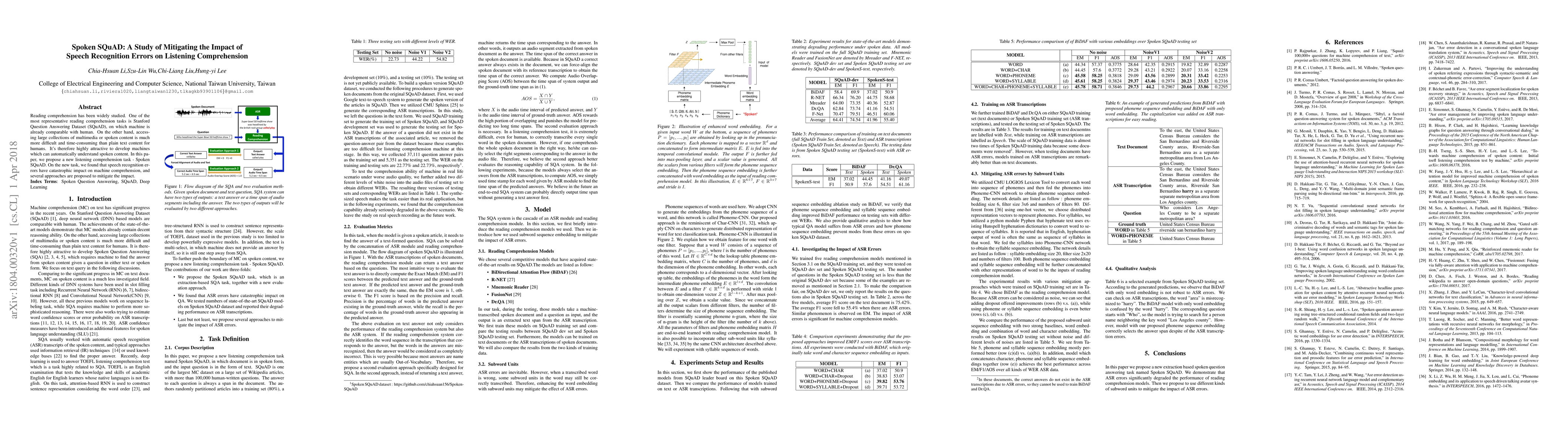 Reading comprehension has been widely studied. One of the most representative reading comprehension tasks is Stanford Question Answering Dataset (SQuAD), on which machine is already comparable with human. On the other hand, accessing large collections of multimedia or spoken content is much more difficult and time-consuming than plain text content for humans. It's therefore highly attractive to develop machines which can automatically understand spoken content. In this paper, we propose a new listening comprehension task - Spoken SQuAD. On the new task, we found that speech recognition errors have catastrophic impact on machine comprehension, and several approaches are proposed to mitigate the impact.