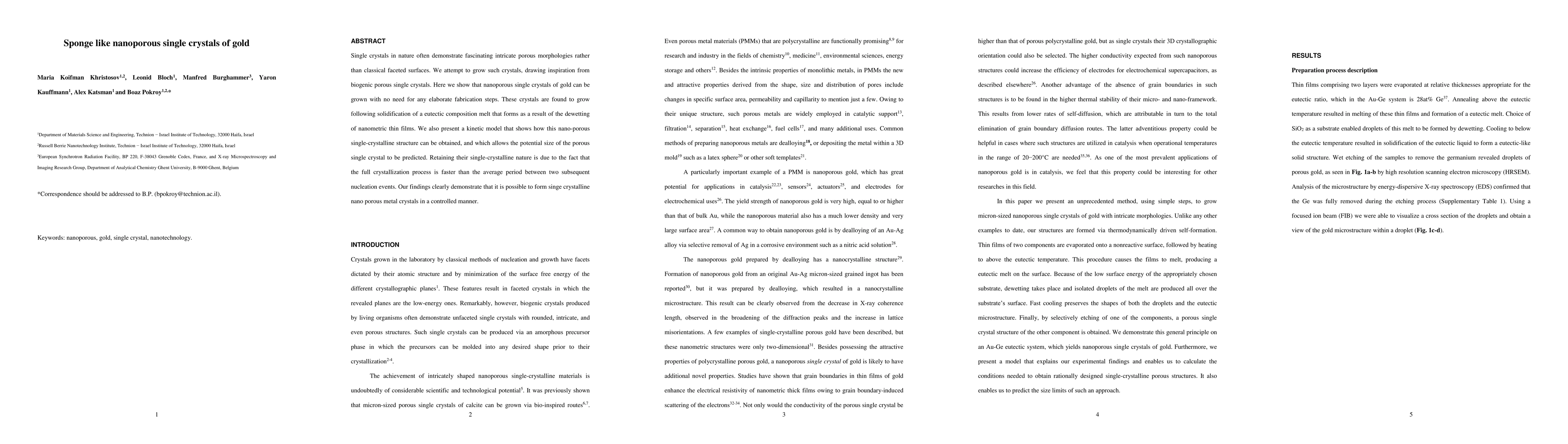 Single crystals in nature often demonstrate fascinating intricate porous morphologies rather than classical faceted surfaces. We attempt to grow such crystals, drawing inspiration from biogenic porous single crystals. Here we show that nanoporous single crystals of gold can be grown with no need for any elaborate fabrication steps. These crystals are found to grow following solidification of a eutectic composition melt that forms as a result of the dewetting of nanometric thin films. We also present a kinetic model that shows how this nano-porous single-crystalline structure can be obtained, and which allows the potential size of the porous single crystal to be predicted. Retaining their single crystalline nature is due to the fact that the full crystallization process is faster than the average period between two subsequent nucleation events. Our findings clearly demonstrate that it is possible to form singe crystalline nano porous metal crystals in a controlled manner. INTRODUCTION