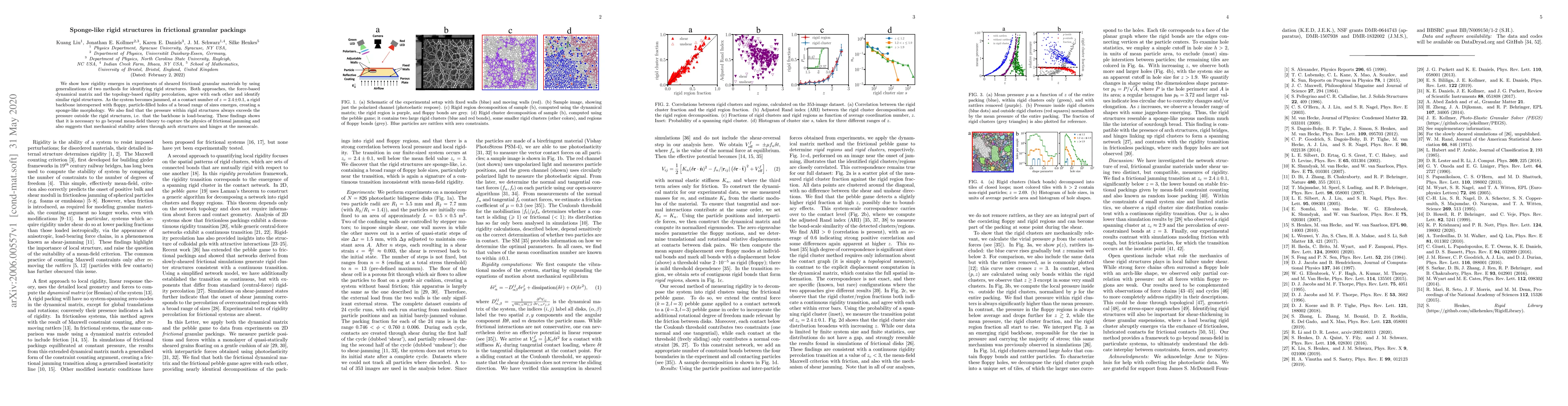 This research demonstrates that rigidity in sheared frictional granular packings emerges through a sponge-like rigid backbone interspersed with floppy regions, identified via force-based and topology-based methods. The rigid backbone is load-bearing and suggests that mechanical stability arises from mesoscale arch structures and hinges.
