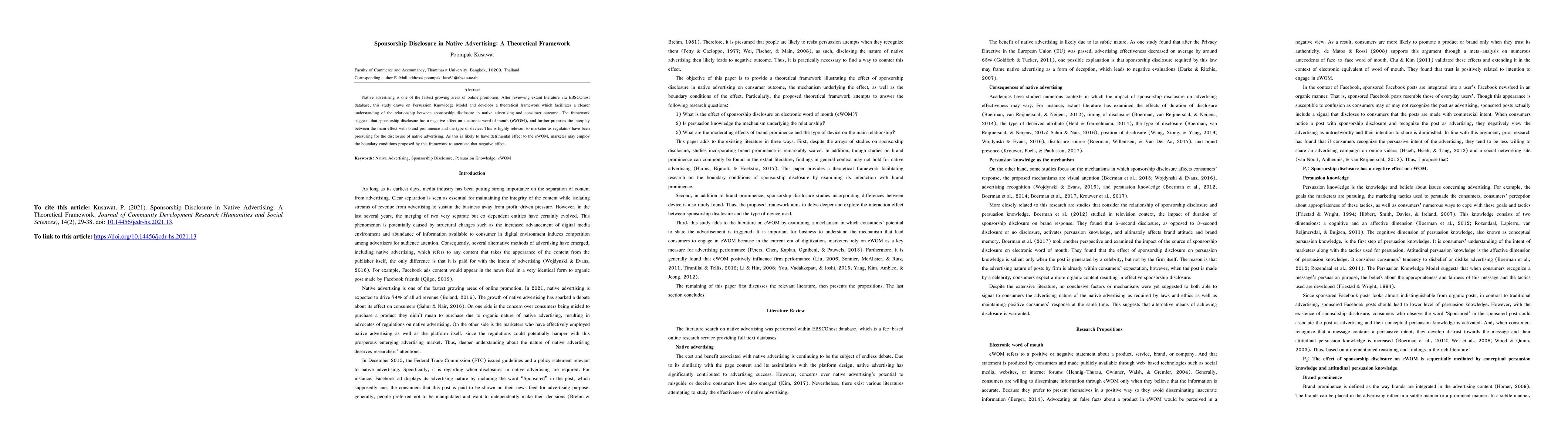 This study develops a theoretical framework based on the Persuasion Knowledge Model to understand the relationship between sponsorship disclosure in native advertising and consumer outcomes, suggesting that disclosure negatively impacts electronic word of mouth (eWOM). It also explores how brand prominence and device type moderate this effect, providing marketers with insights to mitigate the negative impact of disclosure.