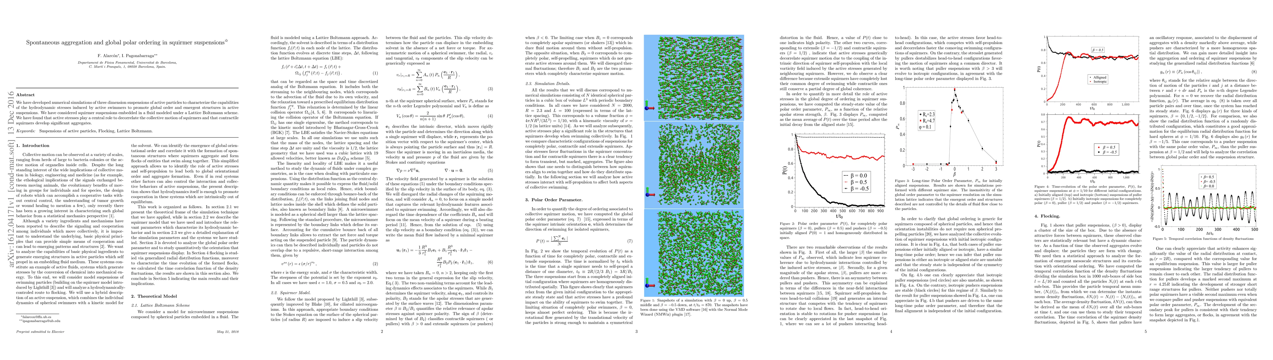 Summary: Numerical simulations reveal that hydrodynamic stresses from active squirmers in three-dimensional suspensions can induce global polar order and spontaneous aggregation, with contractile squirmers forming significant aggregates due to these active stresses.