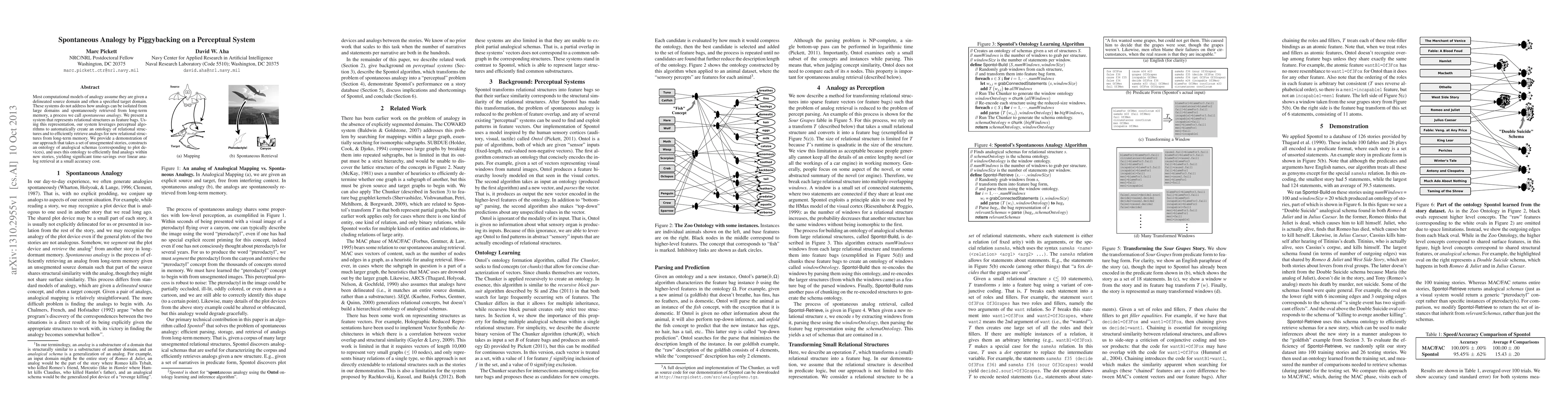 Most computational models of analogy assume they are given a delineated source domain and often a specified target domain. These systems do not address how analogs can be isolated from large domains and spontaneously retrieved from long-term memory, a process we call spontaneous analogy. We present a system that represents relational structures as feature bags. Using this representation, our system leverages perceptual algorithms to automatically create an ontology of relational structures and to efficiently retrieve analogs for new relational structures from long-term memory. We provide a demonstration of our approach that takes a set of unsegmented stories, constructs an ontology of analogical schemas (corresponding to plot devices), and uses this ontology to efficiently find analogs within new stories, yielding significant time-savings over linear analog retrieval at a small accuracy cost.