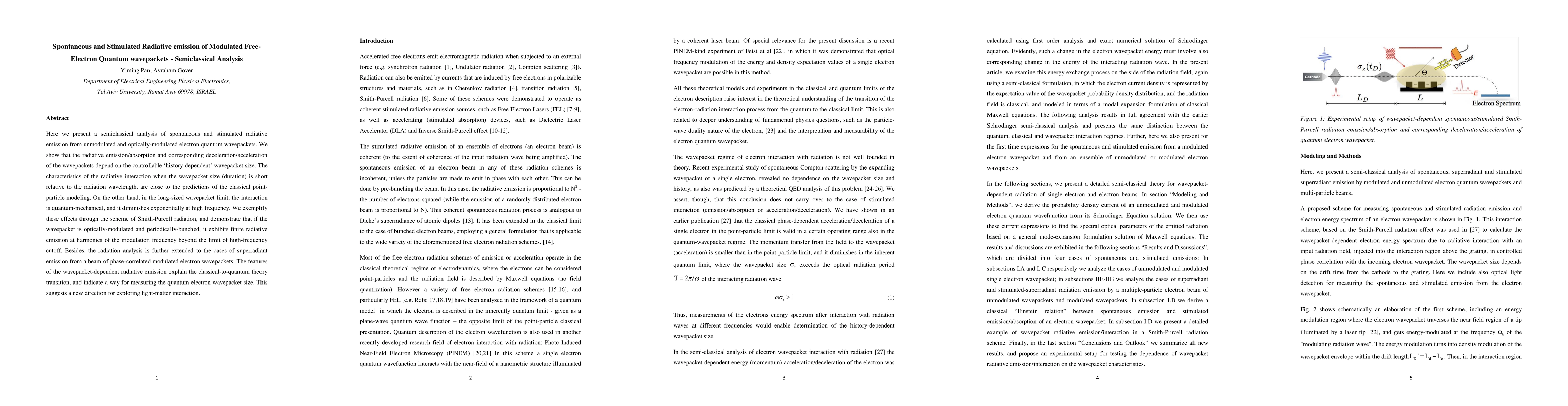 This paper presents a semiclassical analysis of radiative emission from modulated free-electron quantum wavepackets, showing that wavepacket size influences both spontaneous and stimulated emission, with classical predictions holding for short wavepackets and quantum effects dominating for long ones. The study also demonstrates superradiant emission from phase-correlated modulated wavepackets, suggesting new methods for measuring quantum electron wavepacket size and exploring light-matter interactions.