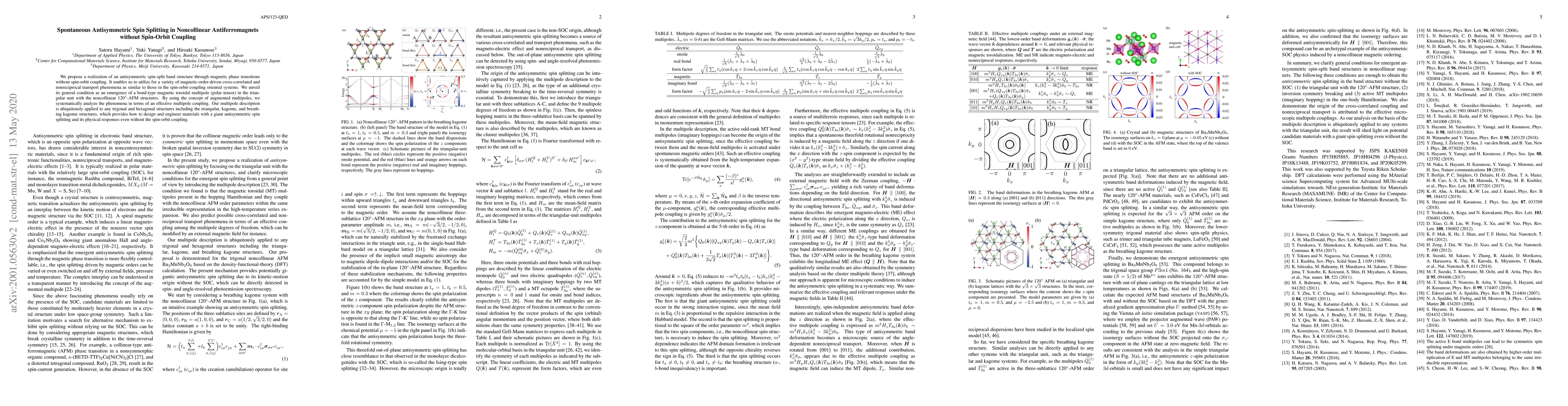 We propose a realization of an antisymmetric spin-split band structure through magnetic phase transitions without spin-orbit coupling. It enables us to utilize for a variety of magnetic-order-driven cross-correlated and nonreciprocal transport phenomena as similar to those in the spin-orbit-coupling oriented systems. We unveil its general condition as an emergence of a bond-type magnetic toroidal multipole (polar tensor) in the triangular unit with the noncollinear 120$^{\circ}$-AFM structures. By using the concept of augmented multipoles, we systematically analyze the phenomena in terms of an effective multipole coupling. Our multipole description is ubiquitously applied to any trigonal and hexagonal structures including the triangular, kagome, and breathing kagome structures, which provides how to design and engineer materials with a giant antisymmetric spin splitting and its physical responses even without the spin-orbit coupling.