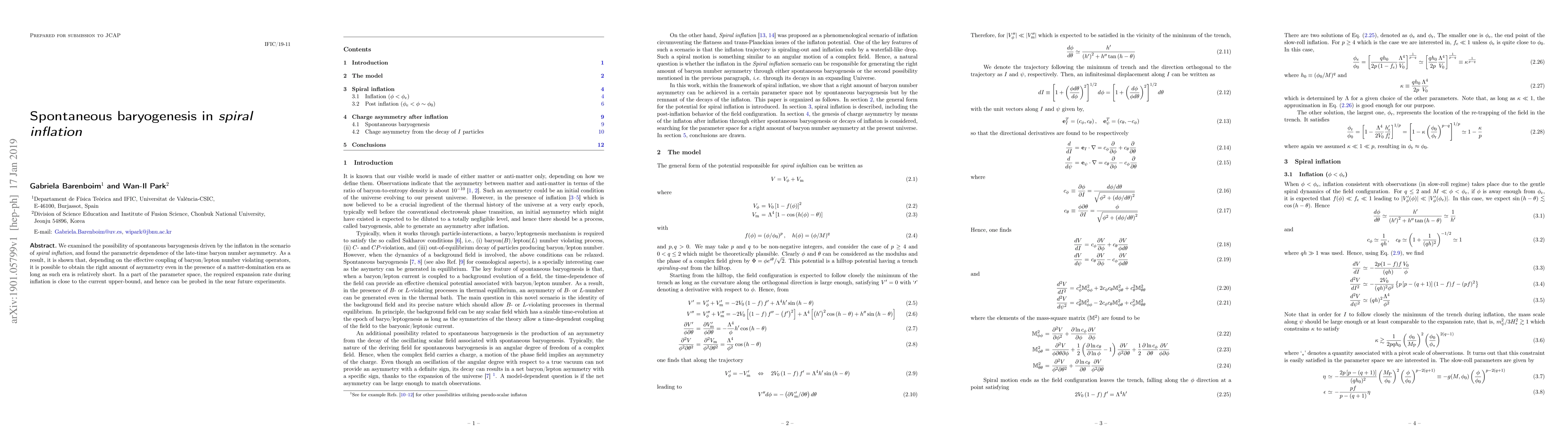 This paper explores spontaneous baryogenesis in spiral inflation, demonstrating that the right baryon asymmetry can be achieved depending on the effective coupling of baryon/lepton number violating operators, even with a relatively short matter-domination era. The required inflation expansion rate is near the current upper-bound, potentially testable in future experiments.