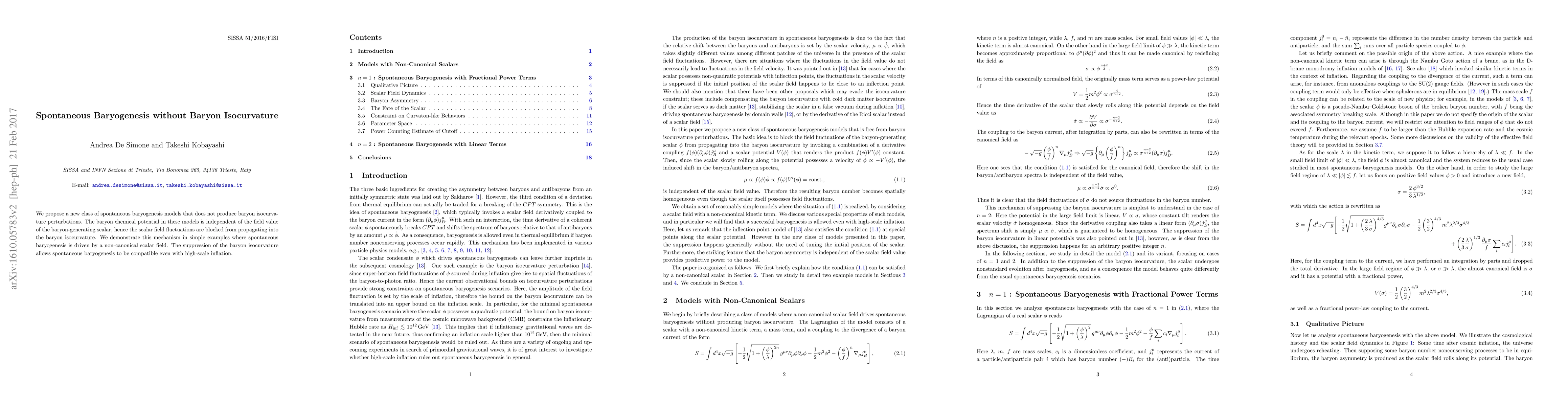 This paper proposes a novel spontaneous baryogenesis model that avoids baryon isocurvature perturbations by decoupling the baryon chemical potential from the field value of the baryon-generating scalar, thus preventing scalar field fluctuations from contributing to baryon isocurvature. This mechanism enables compatibility with high-scale inflation.