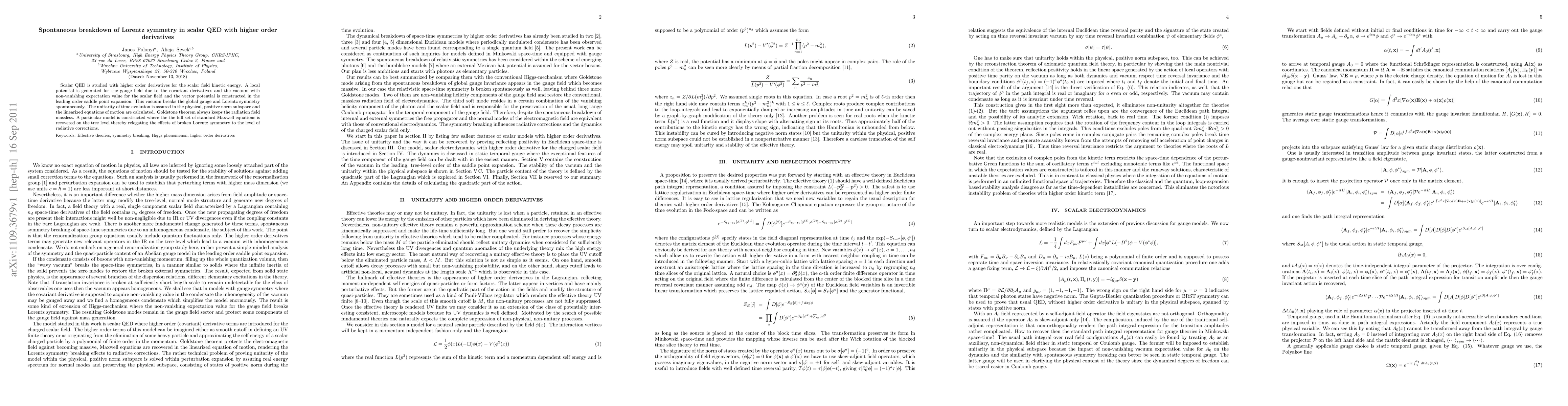 Scalar QED is studied with higher order derivatives for the scalar field kinetic energy. A local potential is generated for the gauge field due to the covariant derivatives and the vacuum with non-vanishing expectation value for the scalar field and the vector potential is constructed in the leading order saddle point expansion. This vacuum breaks the global gauge and Lorentz symmetry spontaneously. The unitarity of time evolution is assured in the physical, positive norm subspace and the linearized equations of motion are calculated. Goldstone theorem always keeps the radiation field massless. A particular model is constructed where the the full set of standard Maxwell equations is recovered on the tree level thereby relegating the effects of broken Lorentz symmetry to the level of radiative corrections.