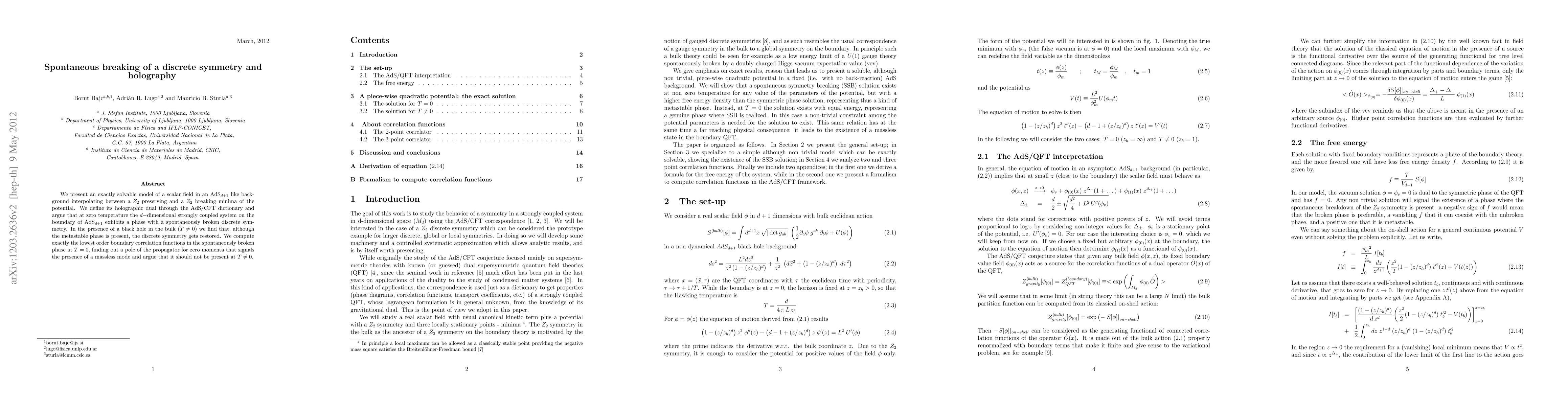 We present an exactly solvable model of a scalar field in an AdS$_{d+1}$ like background interpolating between a $Z_2$ preserving and a $Z_2$ breaking minima of the potential. We define its holographic dual through the AdS/CFT dictionary and argue that at zero temperature the $d-$dimensional strongly coupled system on the boundary of AdS$_{d+1}$ exhibits a phase with a spontaneously broken discrete symmetry. In the presence of a black hole in the bulk ($T\neq 0$) we find that, although the metastable phase is present, the discrete symmetry gets restored. We compute exactly the lowest order boundary correlation functions in the spontaneously broken phase at T=0, finding out a pole of the propagator for zero momenta that signals the presence of a massless mode.