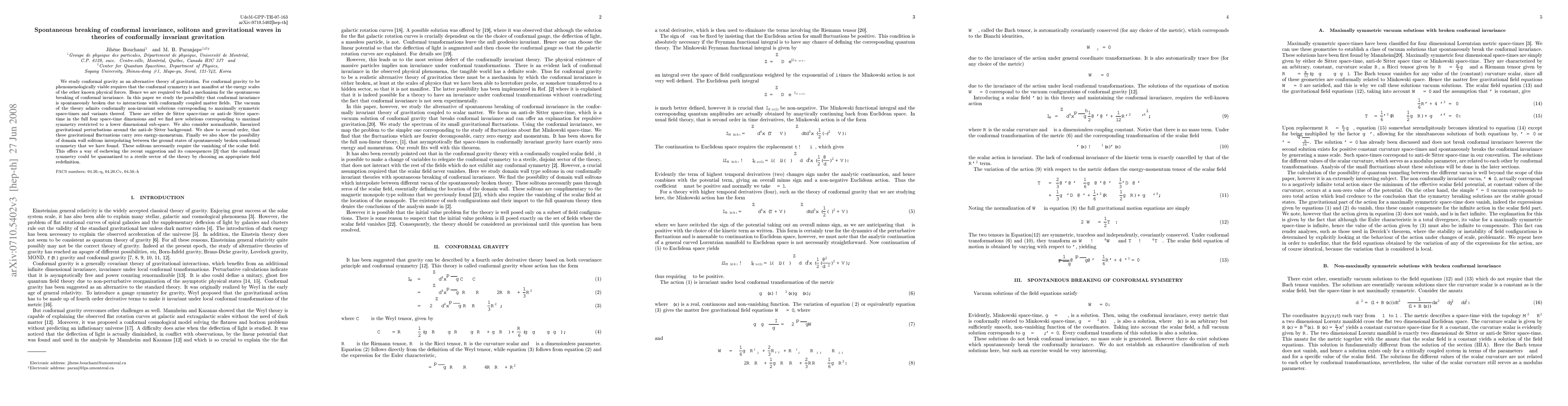 This paper explores the spontaneous breaking of conformal invariance in conformal gravity, proposing that such breaking occurs through interactions with matter fields. It demonstrates that gravitational waves in this context carry zero energy-momentum, consistent with previous findings, and introduces the possibility of domain wall solitons resulting from the broken symmetry.