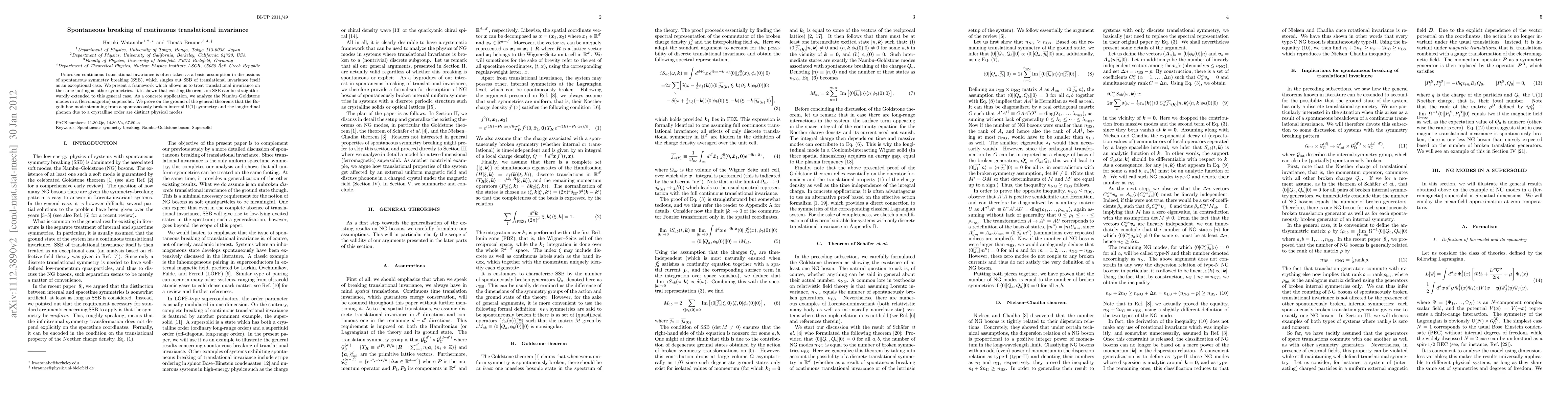 Unbroken continuous translational invariance is often taken as a basic assumption in discussions of spontaneous symmetry breaking (SSB), which singles out SSB of translational invariance itself as an exceptional case. We present a framework which allows us to treat translational invariance on the same footing as other symmetries. It is shown that existing theorems on SSB can be straightforwardly extended to this general case. As a concrete application, we analyze the Nambu-Goldstone modes in a (ferromagnetic) supersolid. We prove on the ground of the general theorems that the Bogoliubov mode stemming from a spontaneously broken internal U(1) symmetry and the longitudinal phonon due to a crystalline order are distinct physical modes.