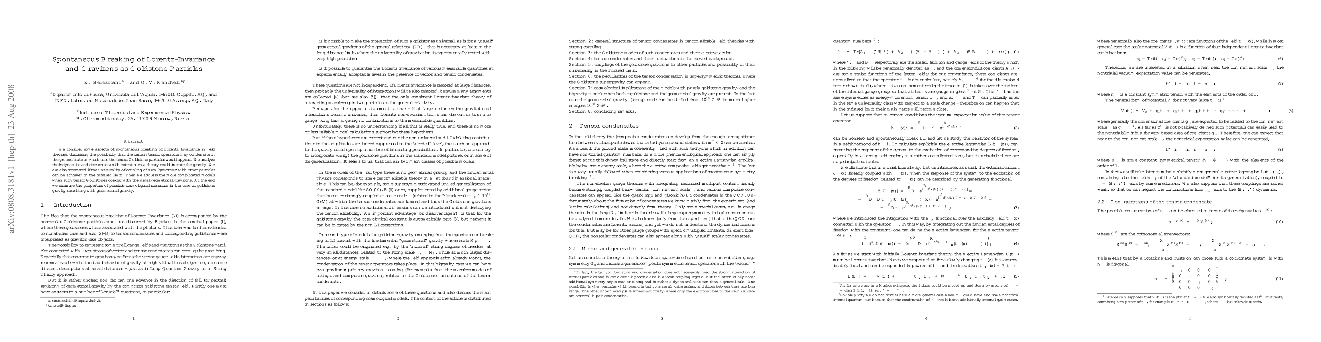 We consider some aspects of spontaneous breaking of Lorentz Invariance in field theories, discussing the possibility that the certain tensor operators may condensate in the ground state in which case the tensor Goldstone particles would appear. We analyze their dynamics and discuss to which extent such a theory could imitate the gravity. We are also interested if the universality of coupling of such `gravitons' with other particles can be achieved in the infrared limit. Then we address the more complicated models when such tensor Goldstones coexist with the usual geometrical gravitons. At the end we examine the properties of possible cosmological scenarios in the case of goldstone gravity coexisting with geometrical gravity.