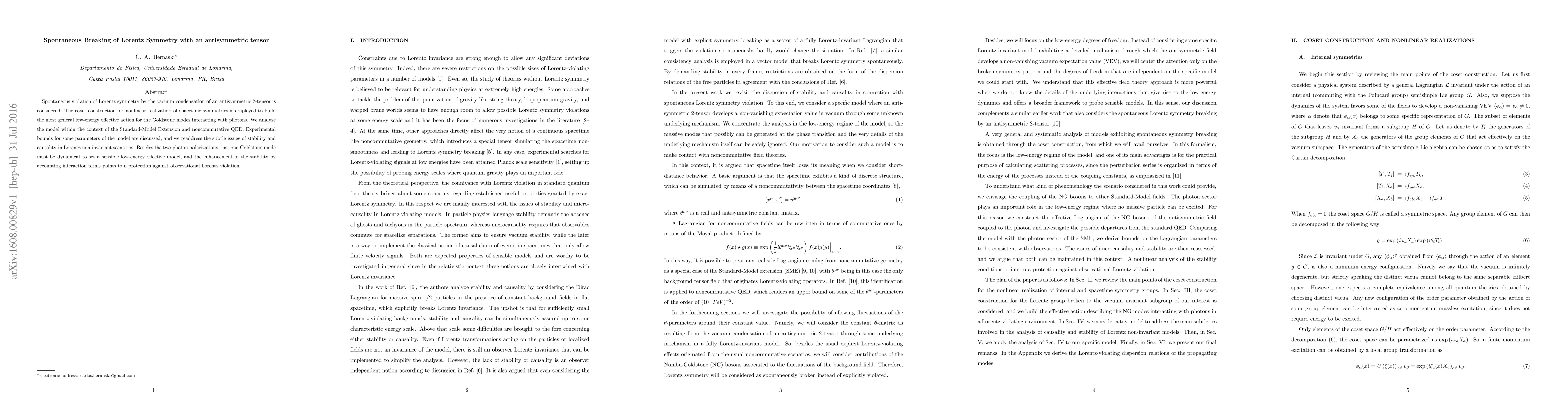 This paper explores the spontaneous breaking of Lorentz symmetry through the vacuum condensation of an antisymmetric tensor, constructing a low-energy effective action for Goldstone modes interacting with photons. The study addresses stability and causality issues, suggesting that one dynamical Goldstone mode, along with interaction terms, enhances stability, potentially protecting against observational Lorentz violation.