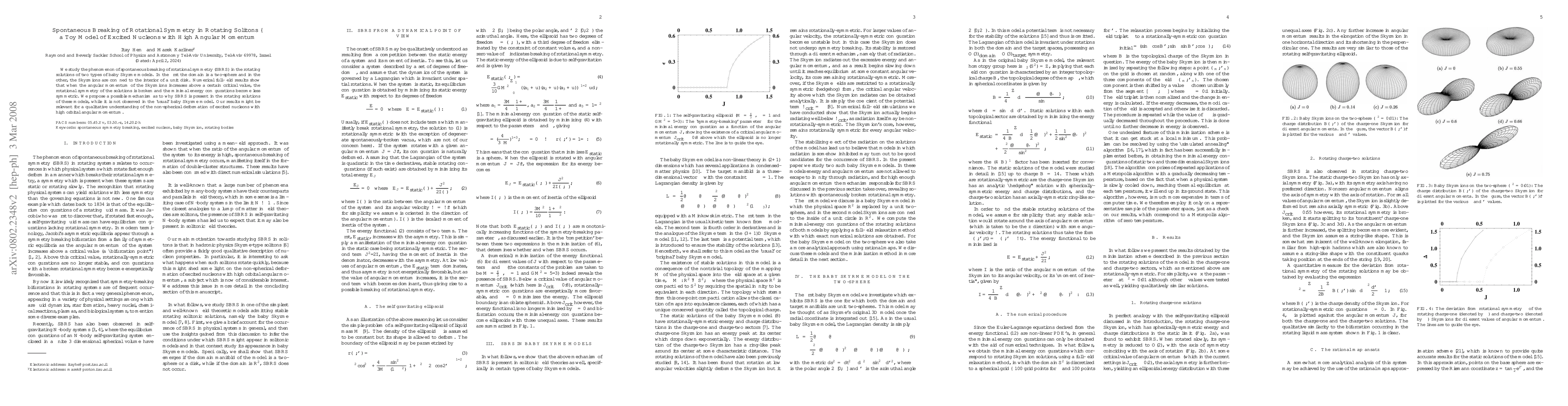 This paper explores spontaneous breaking of rotational symmetry in rotating solitons within two types of simplified Skyrme models, revealing that high angular momentum leads to less symmetric configurations. The findings suggest a mechanism for this phenomenon and may provide insights into the deformation of excited nucleons with high angular momentum.