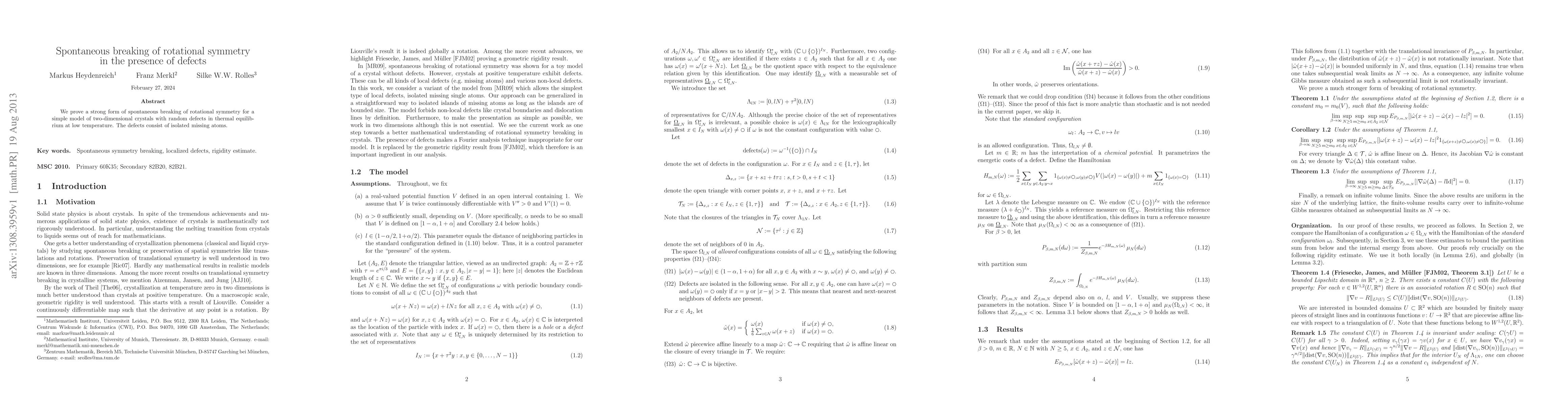 Summary: This paper demonstrates a robust spontaneous breaking of rotational symmetry in a two-dimensional crystal model with randomly distributed defects at low temperatures, showing how isolated missing atoms influence this phenomenon.