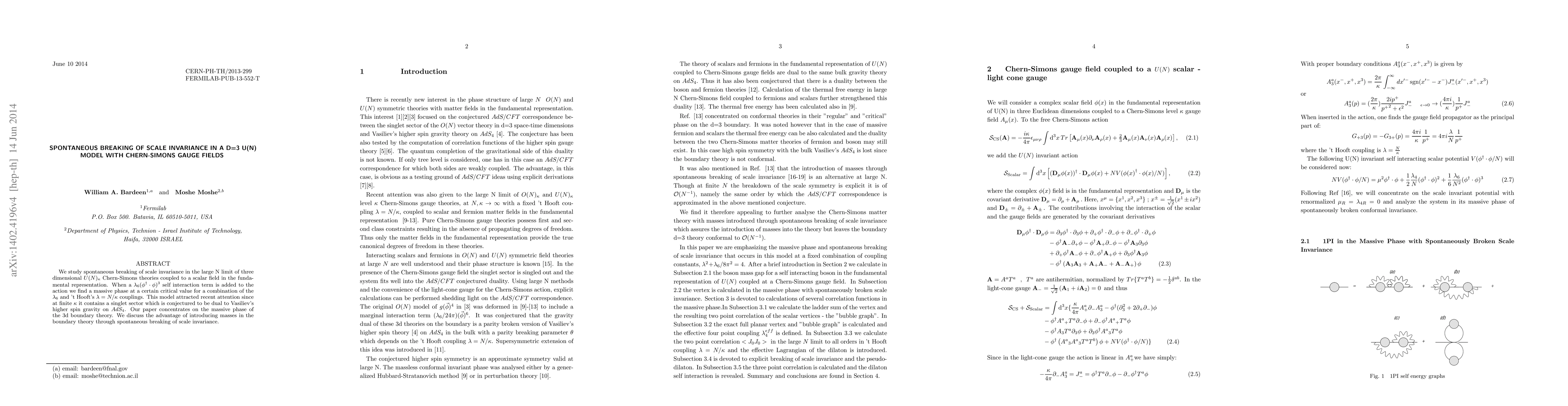 We study spontaneous breaking of scale invariance in the large N limit of three dimensional $U(N)_\kappa$ Chern-Simons theories coupled to a scalar field in the fundamental representation. When a $\lambda_6(\phi^\dagger\cdot\phi)^3$ self interaction term is added to the action we find a massive phase at a certain critical value for a combination of the $\lambda_6$ and 't Hooft's $\lambda=N/\kappa$ couplings. This model attracted recent attention since at finite $\kappa$ it contains a singlet sector which is conjectured to be dual to Vasiliev's higher spin gravity on $AdS_4$. Our paper concentrates on the massive phase of the 3d boundary theory. We discuss the advantage of introducing masses in the boundary theory through spontaneous breaking of scale invariance.