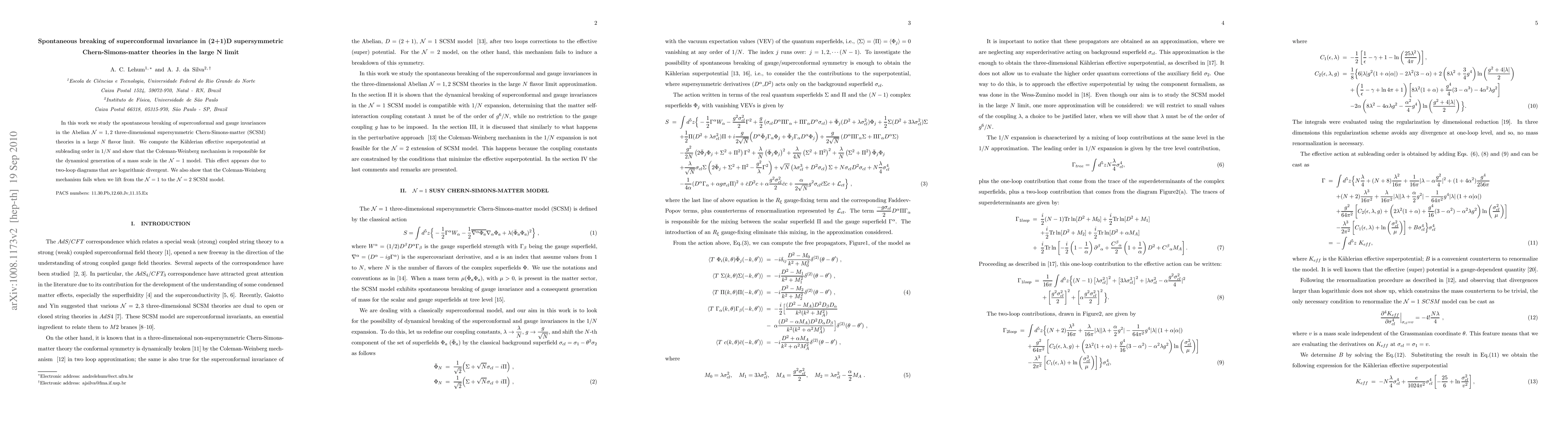 This paper investigates the spontaneous breaking of superconformal and gauge invariances in (2+1)D Abelian supersymmetric Chern-Simons-matter theories, particularly focusing on large N limits. It demonstrates that the Coleman-Weinberg mechanism generates a mass scale in the N=1 model via logarithmically divergent two-loop diagrams, but fails in the N=2 model within a perturbative expansion.