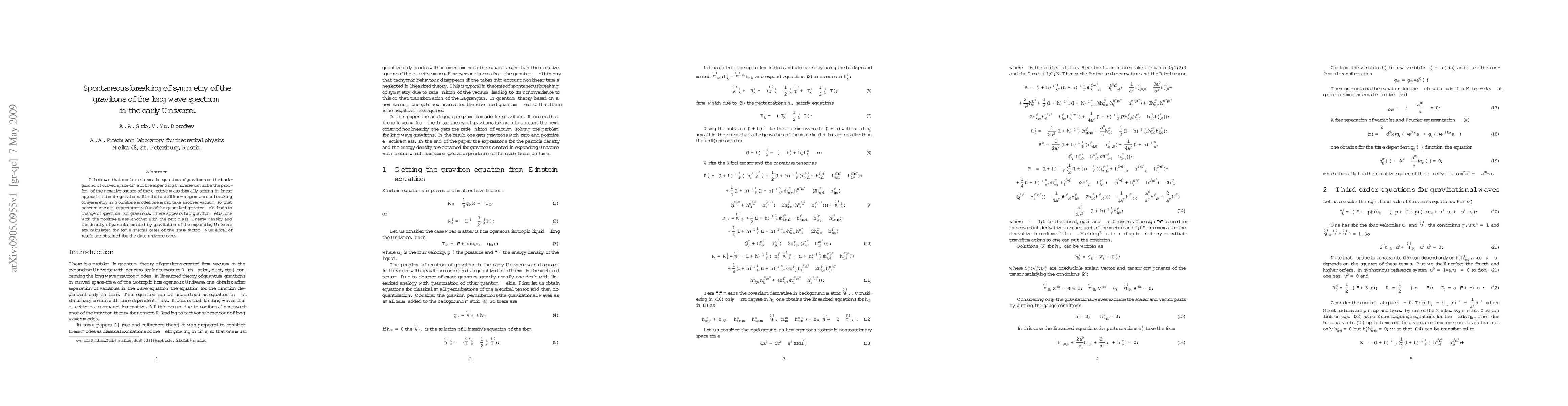 It is shown that nonlinear terms in equations of gravitons on the background of curved space-time of the expanding Universe can solve the problem of the negative square of the effective mass formally arising in linear approximation for gravitons. Similar to well known spontaneous breaking of symmetry in Goldstone model one must take another vacuum so that nonzero vacuum expectation value of the quantized graviton field leads to change of spectrum for gravitons. There appears two graviton fields, one with the positive mass, another with the zero mass. Energy density and the density of particles created by gravitation of the expanding Universe are calculated for some special cases of the scale factor. Numerical of result are obtained for the dust universe case.