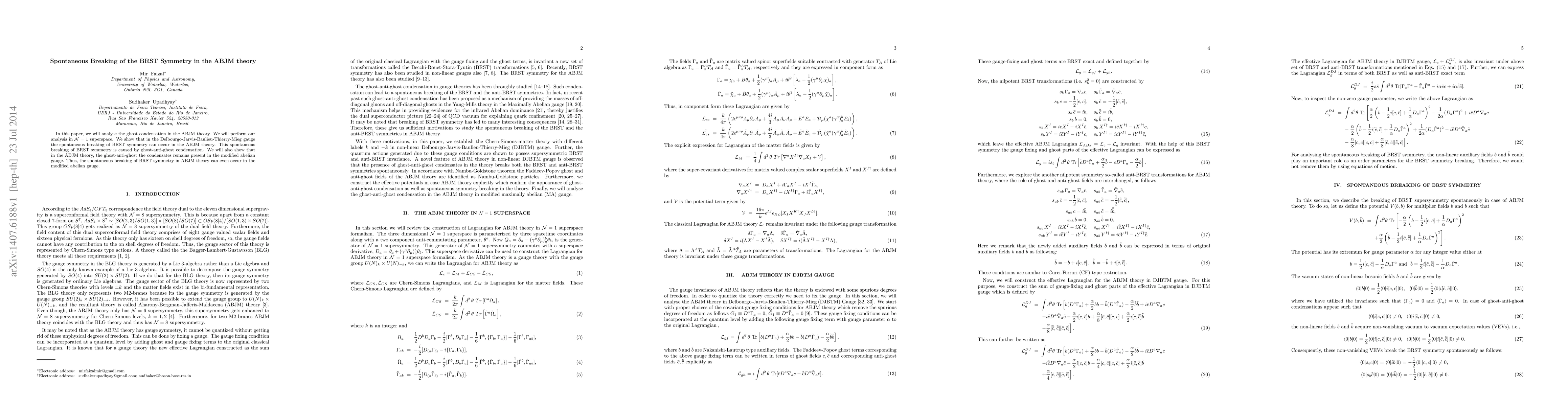 The paper presents a detailed analysis of ghost condensation and BRST symmetry breaking in the ABJM theory within specific gauges, providing insights into the non-linear dynamics and auxiliary fields.