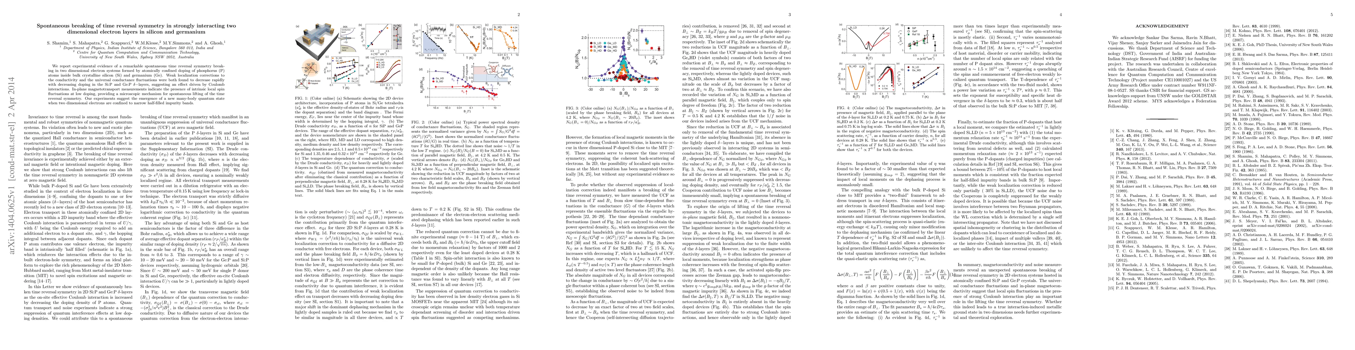 This paper reports experimental evidence of spontaneous breaking of time reversal symmetry in two-dimensional electron systems in silicon and germanium, driven by Coulomb interactions and intrinsic local spin fluctuations. The study finds a new many-body quantum state emerging in half-filled impurity bands.