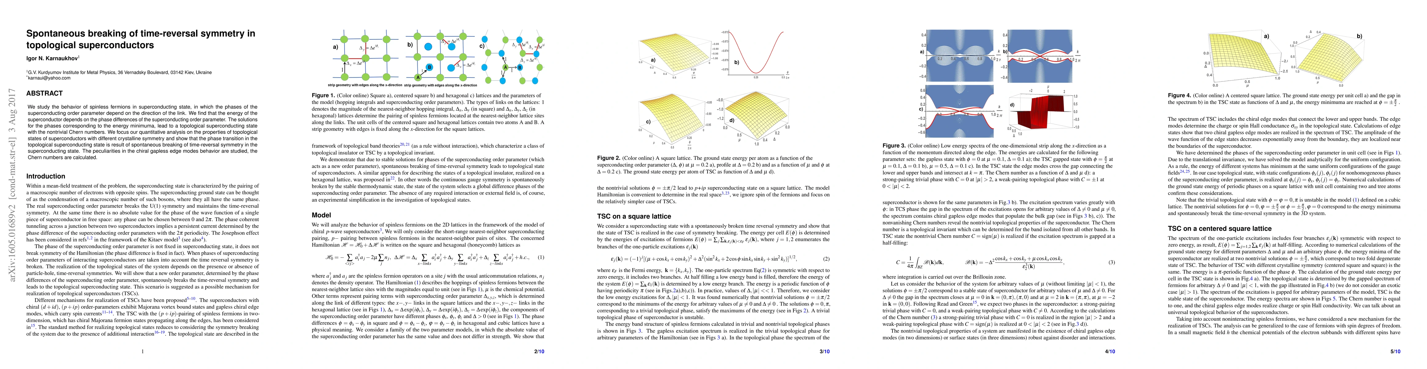 We study the behavior of spinless fermions in superconducting state, in which the phases of the superconducting order parameter depend on the direction of the link. We find that the energy of the superconductor depends on the phase differences of the superconducting order parameter. The solutions for the phases corresponding to the energy minimuma, lead to a topological superconducting state with the nontrivial Chern numbers. We focus our quantitative analysis on the properties of topological states of superconductors with different crystalline symmetry and show that the phase transition in the topological superconducting state is result of spontaneous breaking of time-reversal symmetry in the superconducting state. The peculiarities in the chiral gapless edge modes behavior are studied, the Chern numbers are calculated.