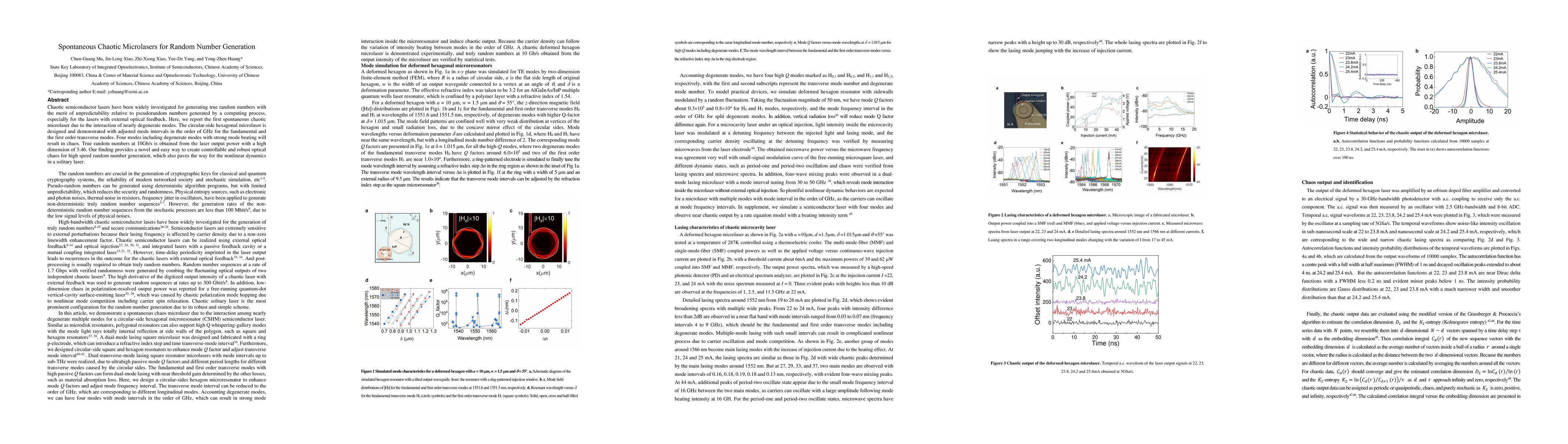 This paper reports the creation of the first spontaneous chaotic microlaser due to nearly degenerate mode interactions, achieving true random number generation at 10Gb/s. The hexagonal microlaser design enables robust optical chaos with high-dimensionality, offering a novel method for high-speed random number generation.