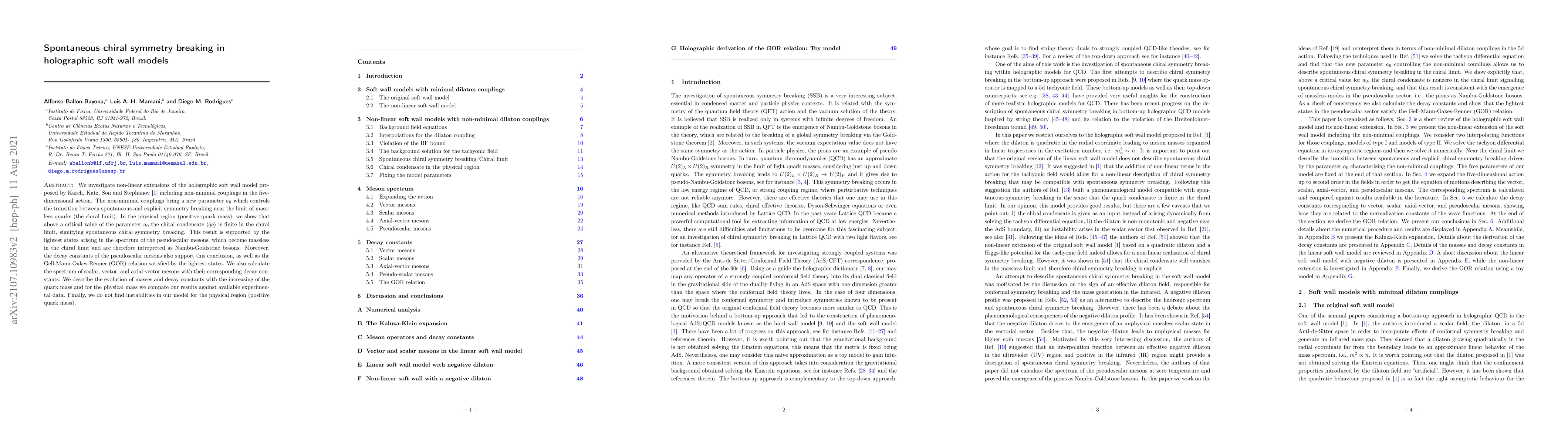 This paper explores non-linear extensions of the holographic soft wall model, introducing a parameter $a_0$ that governs chiral symmetry breaking. It demonstrates spontaneous chiral symmetry breaking in the chiral limit when $a_0$ exceeds a critical value, evidenced by finite chiral condensate and massless pseudoscalar mesons interpreted as Nambu-Goldstone bosons.