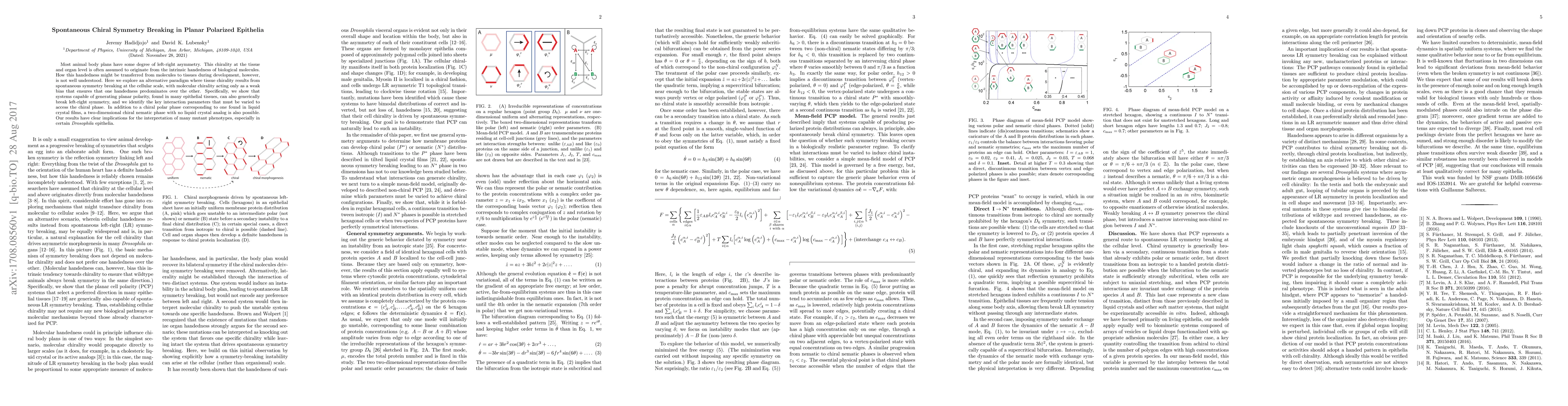 Most animal body plans have some degree of left-right asymmetry. This chirality at the tissue and organ level is often assumed to originate from the intrinsic handedness of biological molecules. How this handedness might be transferred from molecules to tissues during development, however, is not well understood. Here we explore an alternative paradigm where tissue chirality results from spontaneous symmetry breaking at the cellular scale, with molecular chirality acting only as a weak bias that ensures that one handedness predominates over the other. Specifically, we show that systems capable of generating planar polarity, found in many epithelial tissues, can also generically break left-right symmetry, and we identify the key interaction parameters that must be varied to access the chiral phase. In addition to a chiral polar phase corresponding to one found in liquid crystal films, a two-dimensional chiral nematic phase with no liquid crystal analog is also possible. Our results have clear implications for the interpretation of mutant phenotypes, especially in certain Drosophila epithelia.