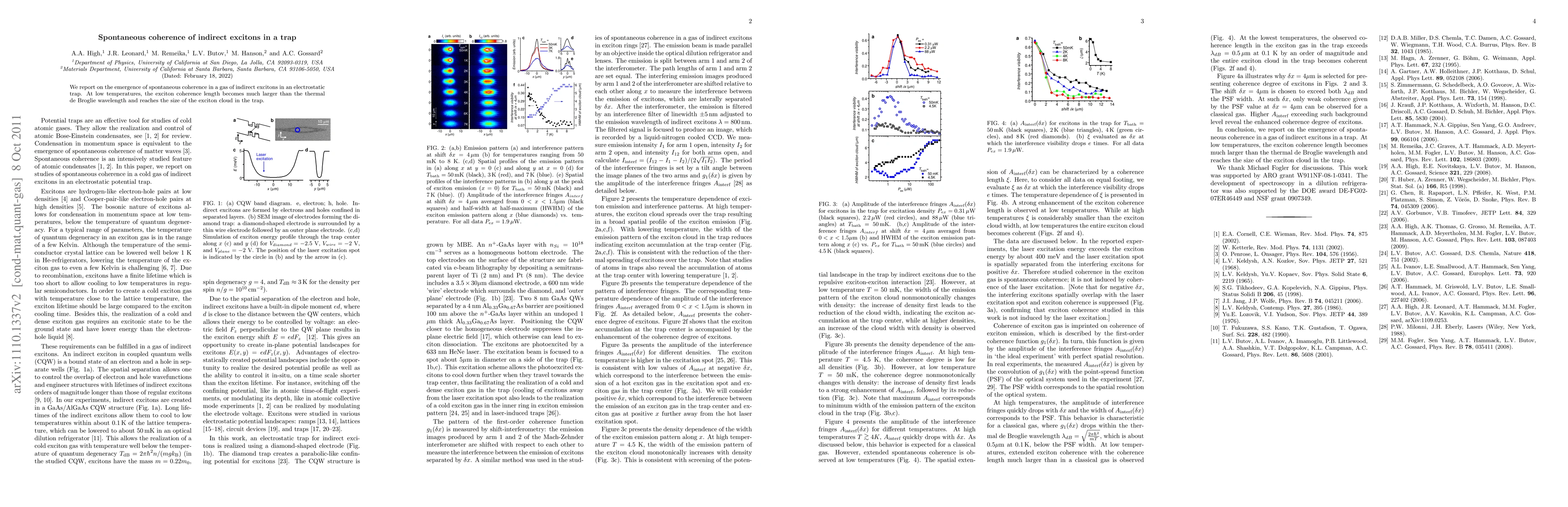 This research demonstrates the emergence of spontaneous coherence in indirect excitons within an electrostatic trap at low temperatures, where the coherence length exceeds the thermal de Broglie wavelength and matches the size of the exciton cloud.
