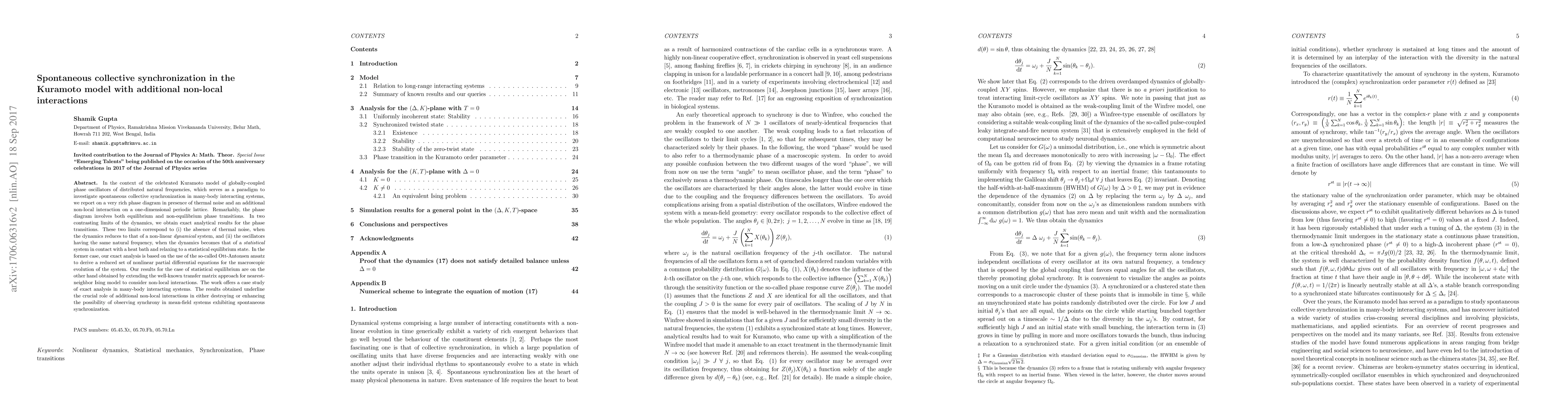 In the context of the celebrated Kuramoto model of globally-coupled phase oscillators of distributed natural frequencies, which serves as a paradigm to investigate spontaneous collective synchronization in many-body interacting systems, we report on a very rich phase diagram in presence of thermal noise and an additional non-local interaction on a one-dimensional periodic lattice. Remarkably, the phase diagram involves both equilibrium and non-equilibrium phase transitions. In two contrasting limits of the dynamics, we obtain exact analytical results for the phase transitions. These two limits correspond to (i) the absence of thermal noise, when the dynamics reduces to that of a non-linear dynamical system, and (ii) the oscillators having the same natural frequency, when the dynamics becomes that of a statistical system in contact with a heat bath and relaxing to a statistical equilibrium state. In the former case, our exact analysis is based on the use of the so-called Ott-Antonsen ansatz to derive a reduced set of nonlinear partial differential equations for the macroscopic evolution of the system. Our results for the case of statistical equilibrium are on the other hand obtained by extending the well-known transfer matrix approach for nearest-neighbor Ising model to consider non-local interactions. The work offers a case study of exact analysis in many-body interacting systems. The results obtained underline the crucial role of additional non-local interactions in either destroying or enhancing the possibility of observing synchrony in mean-field systems exhibiting spontaneous synchronization.