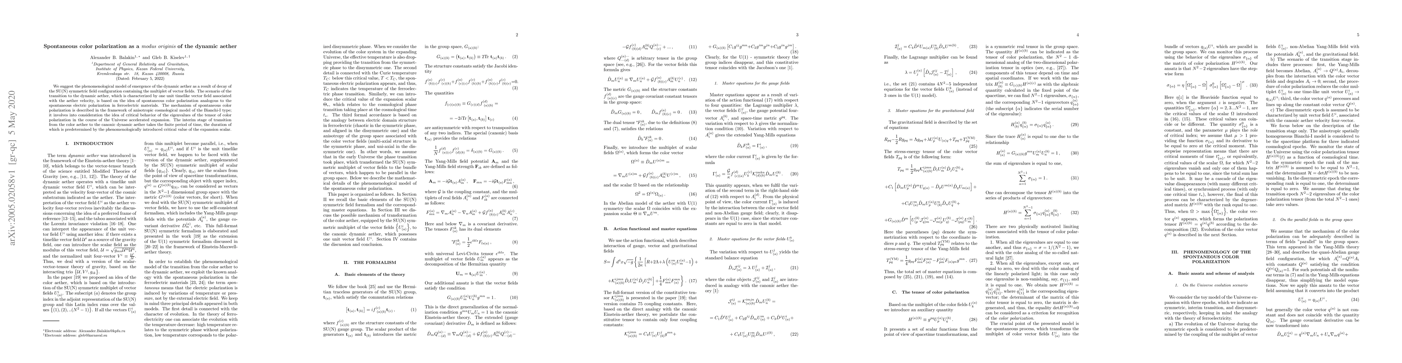 The paper proposes a model for the dynamic aether's origin from SU(N) symmetric field decay, involving spontaneous color polarization akin to ferroelectric materials' electric polarization. This transition, occurring via a Bianchi-I cosmological model, is characterized by a timelike vector field and critical expansion scalar value.