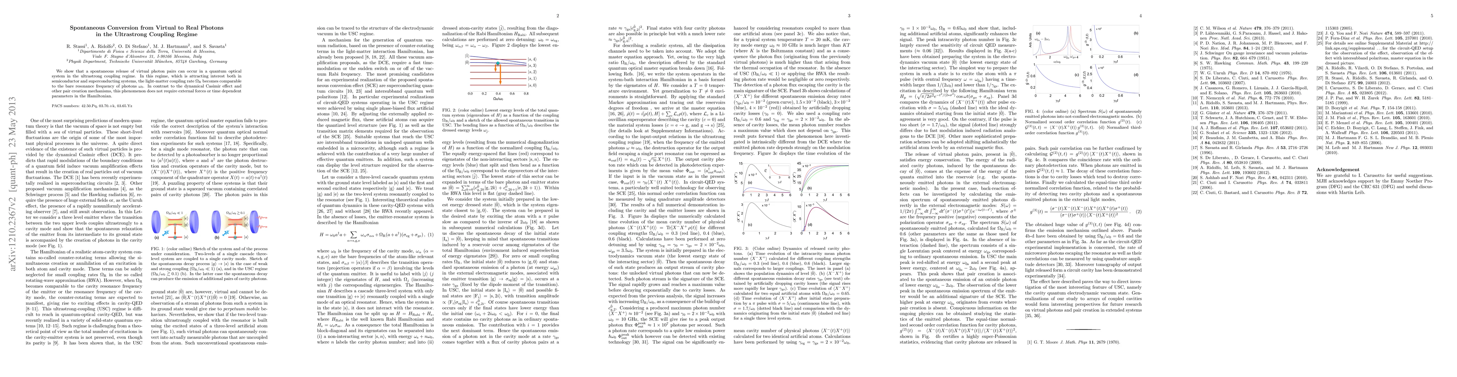 This paper demonstrates a spontaneous conversion of virtual photon pairs in quantum optical systems operating in the ultrastrong coupling regime, where light-matter interaction is comparable to the photon's resonance frequency. Unlike other mechanisms, this process occurs without external forces or time-dependent parameters.