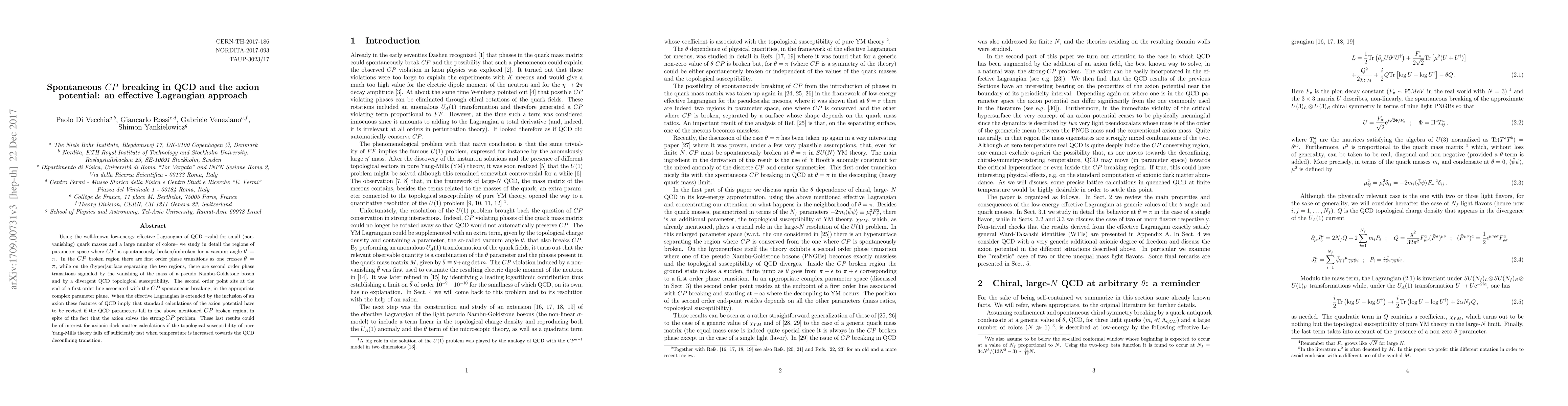 Using the well-known low-energy effective Lagrangian of QCD --valid for small (non-vanishing) quark masses and a large number of colors-- we study in detail the regions of parameter space where $CP$ is spontaneously broken/unbroken for a vacuum angle $\theta= \pi$. In the $CP$-broken region there are first order phase transitions as one crosses $\theta=\pi$, while on the (hyper)surface separating the two regions, there are second order phase transitions signaled by the vanishing of the mass of a pseudo Nambu-Goldstone boson and by a divergent QCD topological susceptibility. The second order point sits at the end of a first order line associated with the $CP$ spontaneous breaking, in the appropriate complex parameter plane. When the effective Lagrangian is extended by the inclusion of an axion these features of QCD imply that standard calculations of the axion potential have to be revised when the QCD parameters fall in the above mentioned $CP$-broken region, in spite of the fact that the axion solves the strong-$CP$ problem. These latter results could be of interest for axionic dark matter calculations if the topological susceptibility of pure Yang-Mills theory falls off sufficiently fast when temperature is increased towards the QCD deconfining transition.