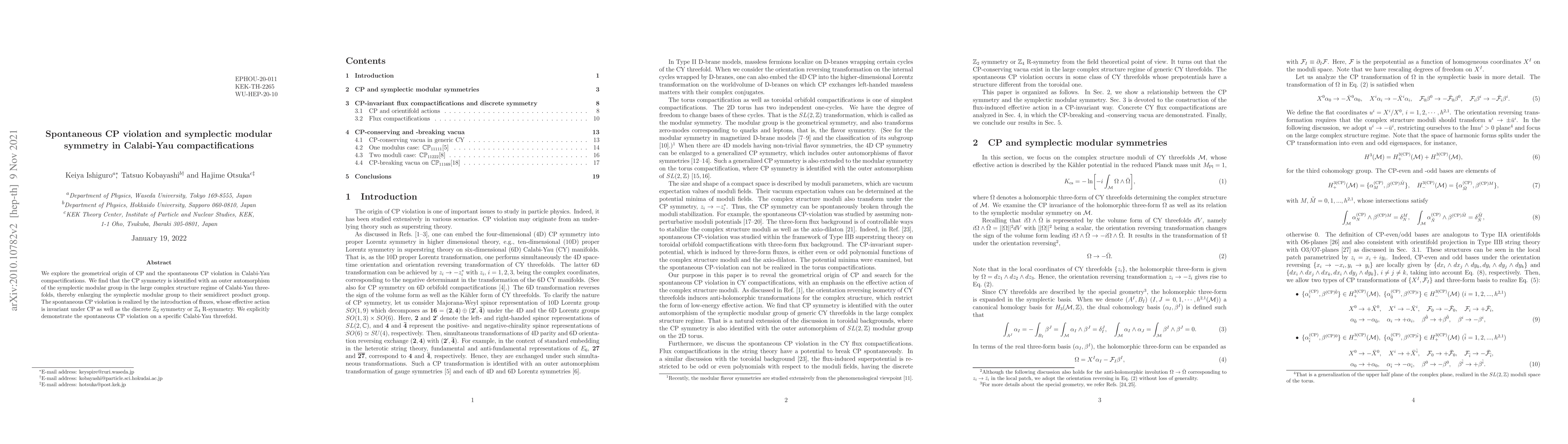 This paper investigates the geometrical origin of CP symmetry in Calabi-Yau compactifications, revealing its identification with an outer automorphism of the symplectic modular group, which leads to a semidirect product group structure. It also demonstrates spontaneous CP violation through the introduction of fluxes, showing invariance under CP and discrete symmetries.