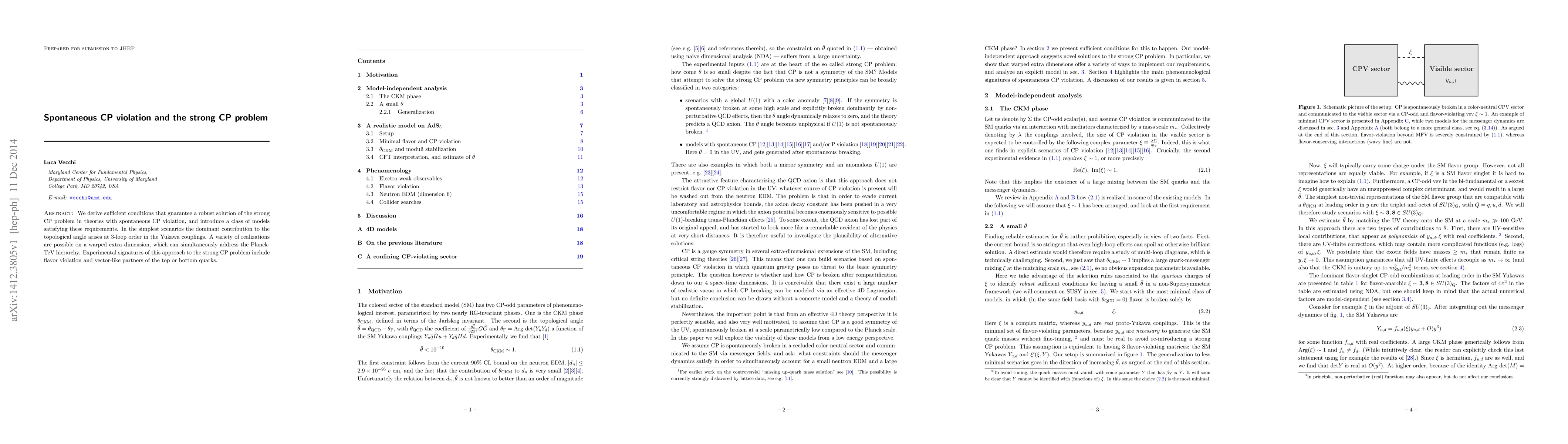 The paper presents a detailed analysis of spontaneous CP violation as a mechanism to solve the strong CP problem, proposing a class of models and identifying warped extra dimensions as a viable framework for addressing the Planck-TeV hierarchy.