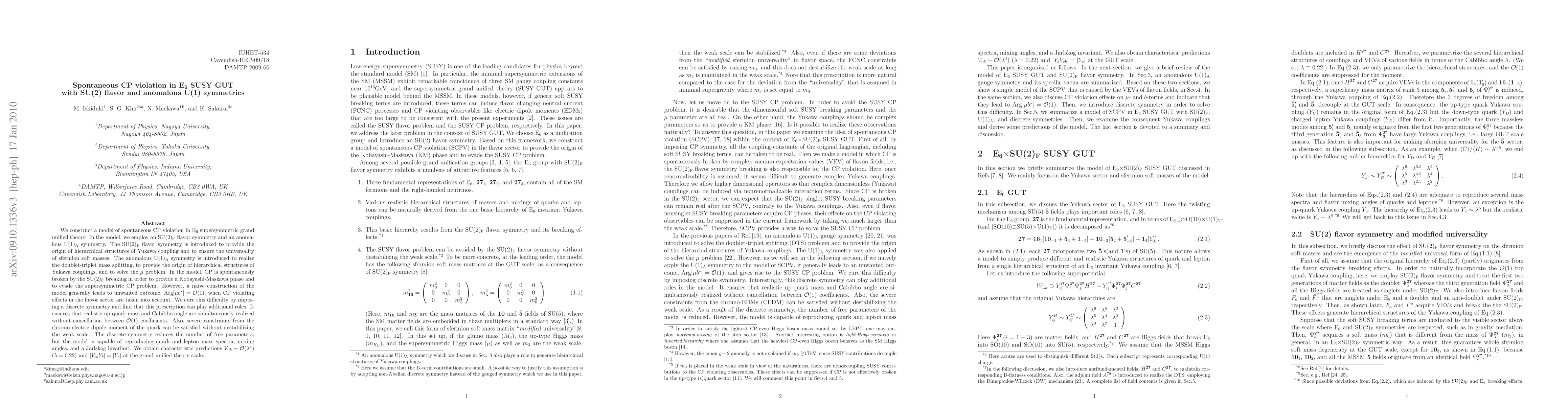 This paper constructs a model of spontaneous CP violation within an E6 SUSY GUT framework, utilizing SU(2)F flavor and an anomalous U(1)A symmetry to address hierarchical Yukawa couplings and the mu problem. A discrete symmetry is introduced to resolve issues with Arg[mu b*] and ensure realistic quark masses and mixing angles, while satisfying chromo-electric dipole moment constraints.