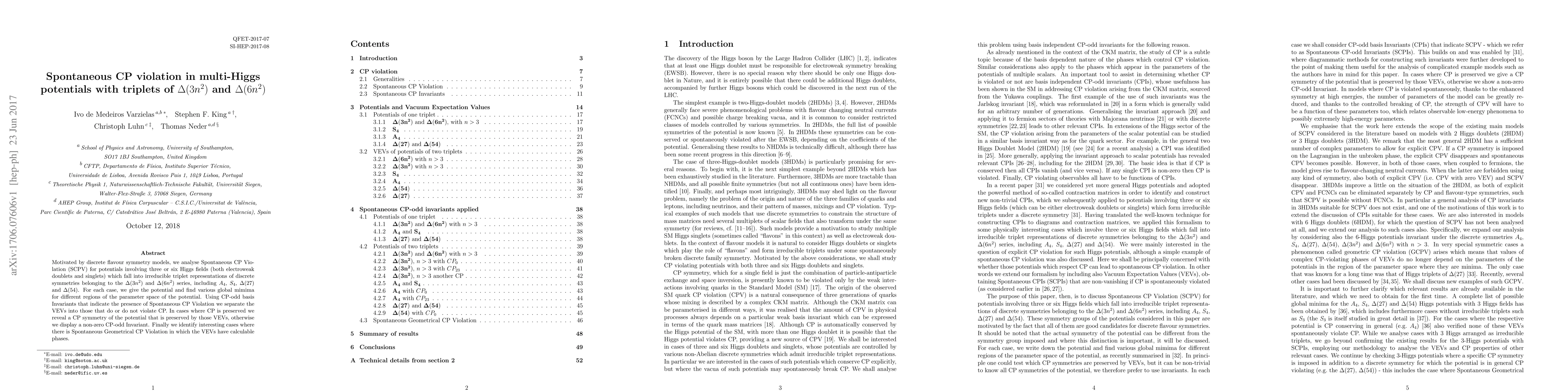 Motivated by discrete flavour symmetry models, we analyse Spontaneous CP Violation (SCPV) for potentials involving three or six Higgs fields (both electroweak doublets and singlets) which fall into irreducible triplet representations of discrete symmetries belonging to the $\Delta(3n^2)$ and $\Delta(6n^2)$ series, including $A_4$, $S_4$, $\Delta(27)$ and $\Delta(54)$. For each case, we give the potential and find various global mimima for different regions of the parameter space of the potential. Using CP-odd basis Invariants that indicate the presence of Spontaneous CP Violation we separate the VEVs into those that do or do not violate CP. In cases where CP is preserved we reveal a CP symmetry of the potential that is preserved by those VEVs, otherwise we display a non-zero CP-odd Invariant. Finally we identify interesting cases where there is Spontaneous Geometrical CP Violation in which the VEVs have calculable phases.