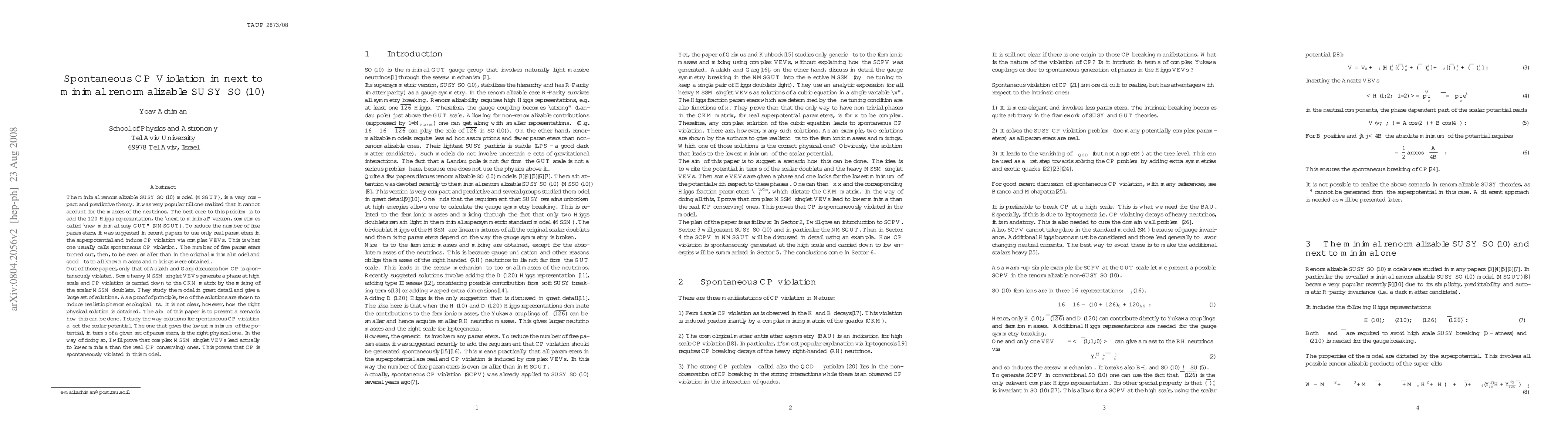 This paper explores spontaneous CP violation in the next to minimal SUSY SO(10) model, demonstrating that complex vacuum expectation values (VEVs) of heavy MSSM singlets can induce CP violation, leading to lower scalar potential minima compared to real VEVs. It concludes that this mechanism is viable for generating realistic phenomenological fits.