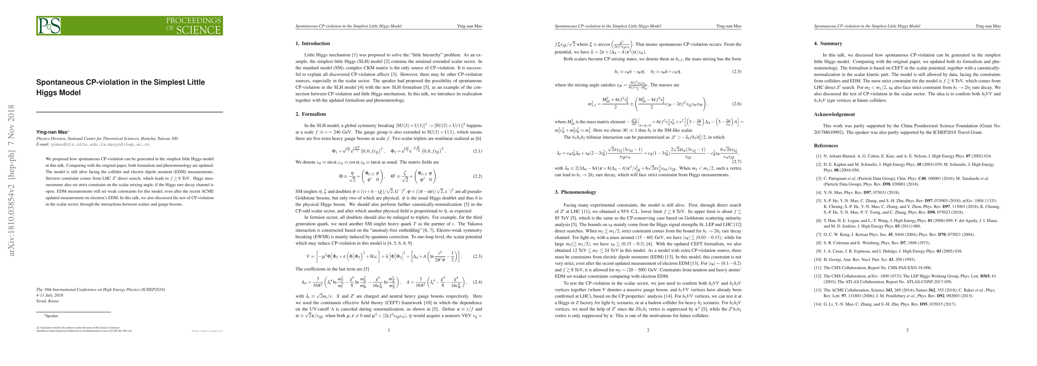 We proposed how spontaneous CP-violation can be generated in the simplest little Higgs model in this talk. Comparing with the original paper, both formalism and phenomenology are updated. The model is still alive facing the collider and electric dipole moment (EDM) measurements. Strictest constraint comes from LHC $Z'$ direct search, which leads to $f\gtrsim8~\textrm{TeV}$. Higgs measurements also set strict constraint on the scalar mixing angle, if the Higgs rare decay channel is open. EDM measurements still set weak constraints for this model, even after the recent ACME updated measurement on electron's EDM. In this talk, we also discussed the test of CP-violation in the scalar sector, through the interactions between scalars and gauge bosons.